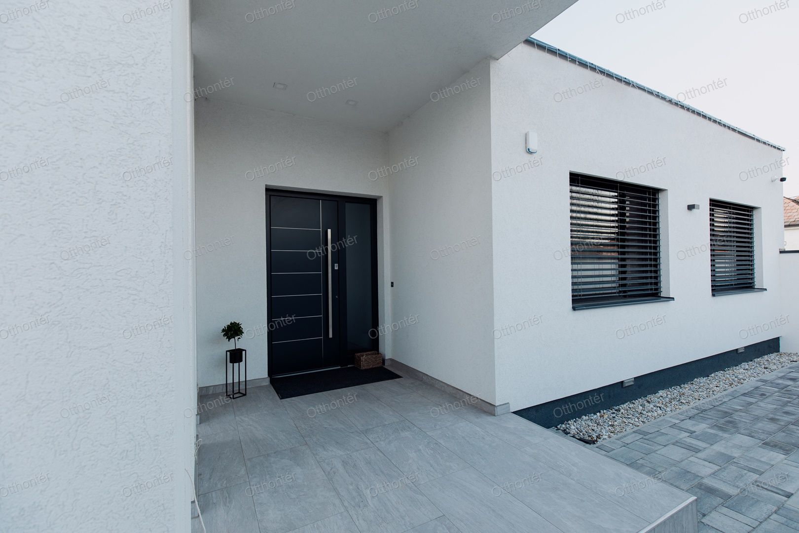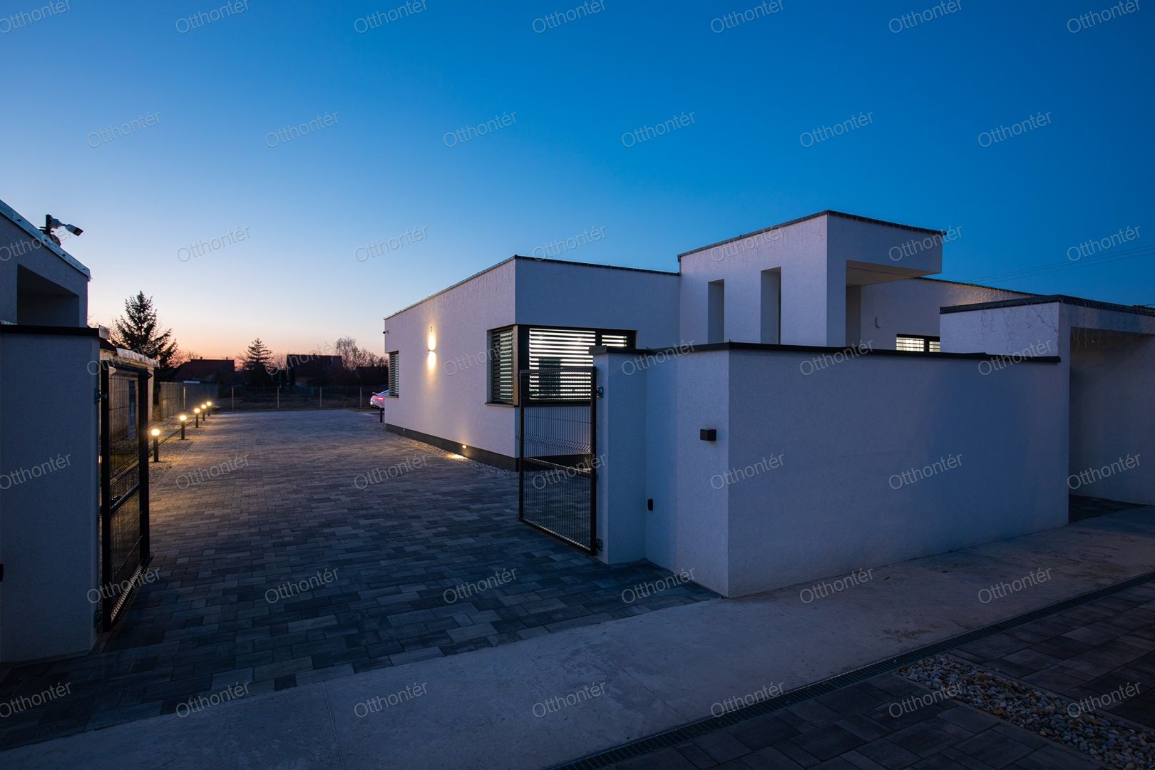 A 2000 m²-es, parkosított kert igazi oázis: olajfák, pálmák és egy automata öntözőrendszer gondoskodnak a pihentető, nyaralásra emlékeztető hangulatról. A telek elrendezése praktikus és látványos egyszerre — több mint 1100 m² zöldfelület és 420 m² térkövezett rész biztosít kényelmet, mozgásteret és eleganciát.
