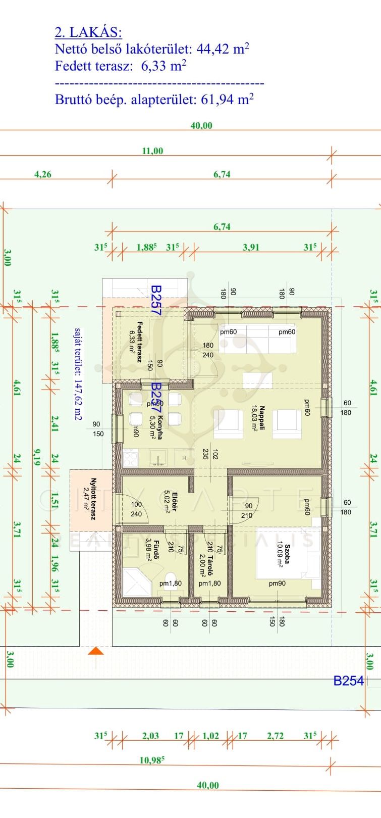 egy előszoba, egy hálószoba, egy fürdőszoba WC-vel, egy amerikai konyhás nappali, illetve egy fedett és egy nyitott terasz kerül kialakításra.