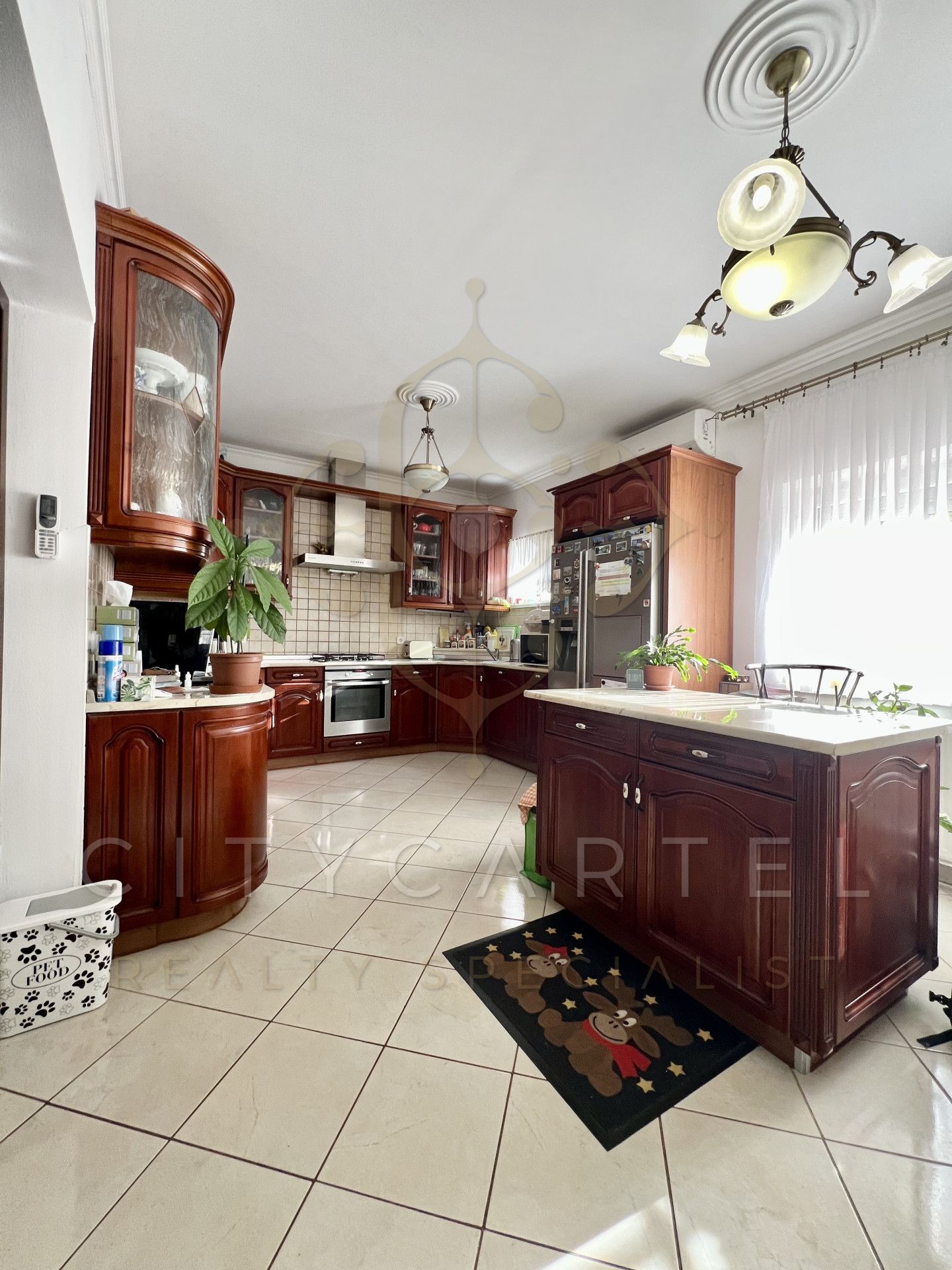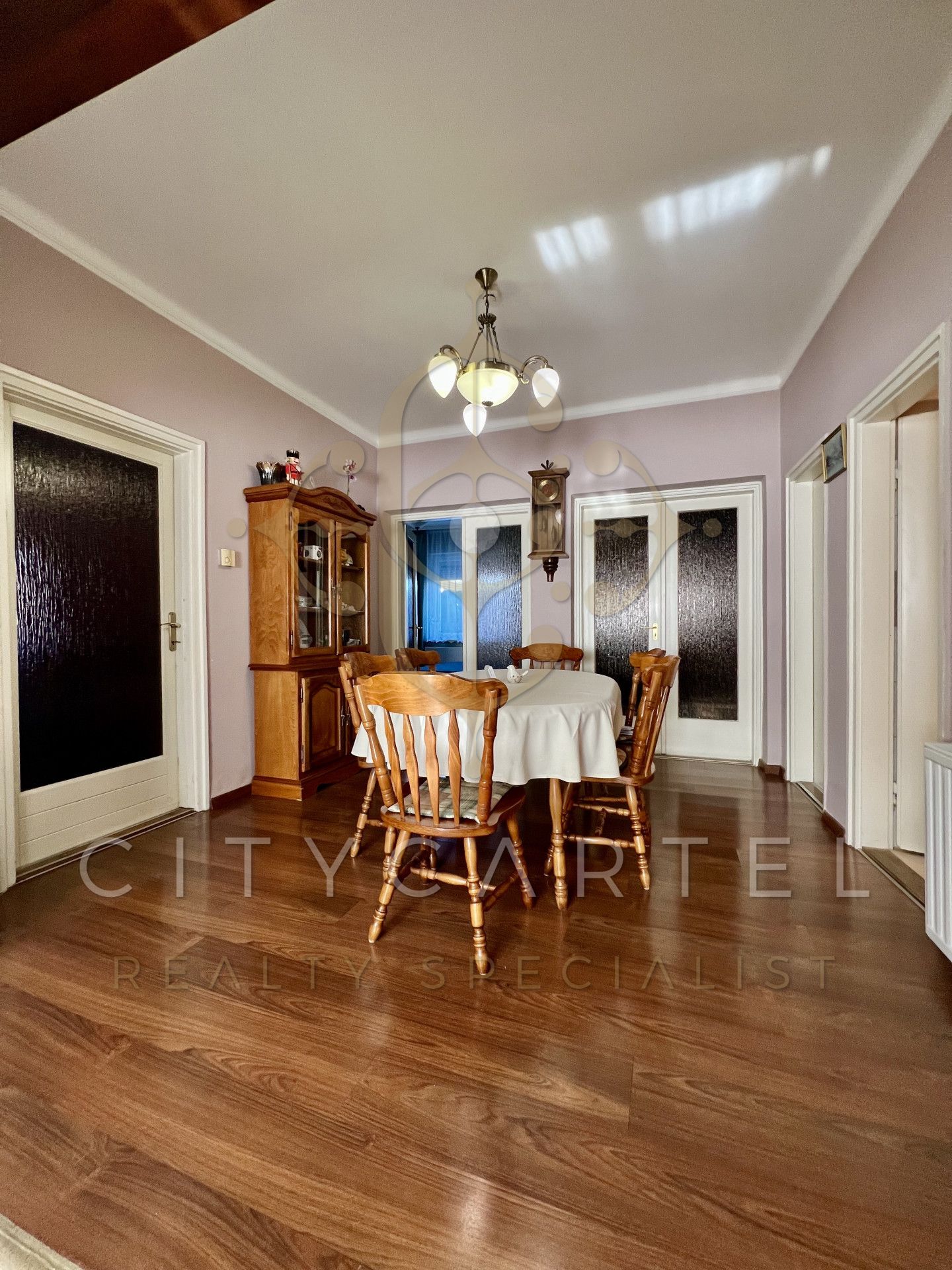 Beosztását tekintve három szoba, egy tágas konyha + étkező egy légtérben, egy WC-s, kádas fürdőszoba, spájz, egy WC-vel rendelkező háztartási helyiség, illetve egy télikertként használt, beépített terasz került benne kialaktításra.