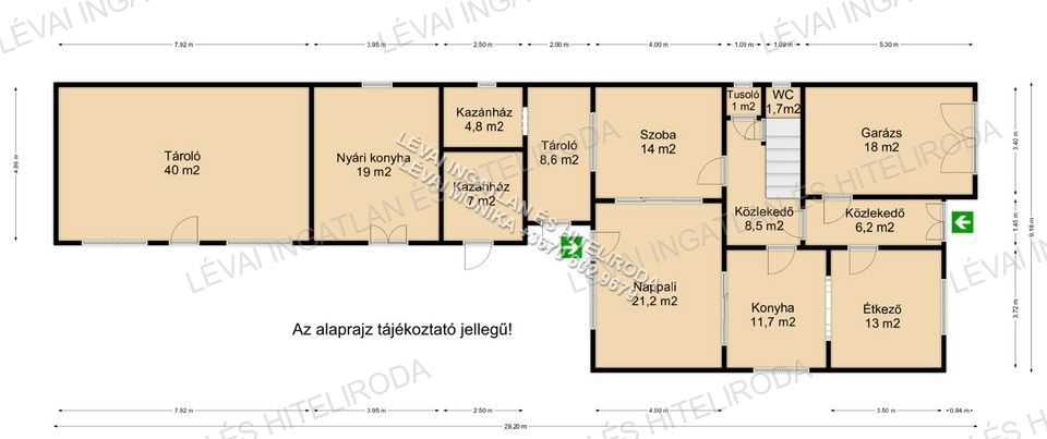 A Lévai Ingatlan és Hiteliroda megvételre kínál egy KIVÁLÓ állapotú, kétszintes családi házat 2000 m2-es telken. A 180 m2-es főépületben az alsó szinten garázs, előszoba, étkező, konyha, nappali (a nappali egy része tolóajtóval külön szobává alakítható), WC és zuhanyzó található.