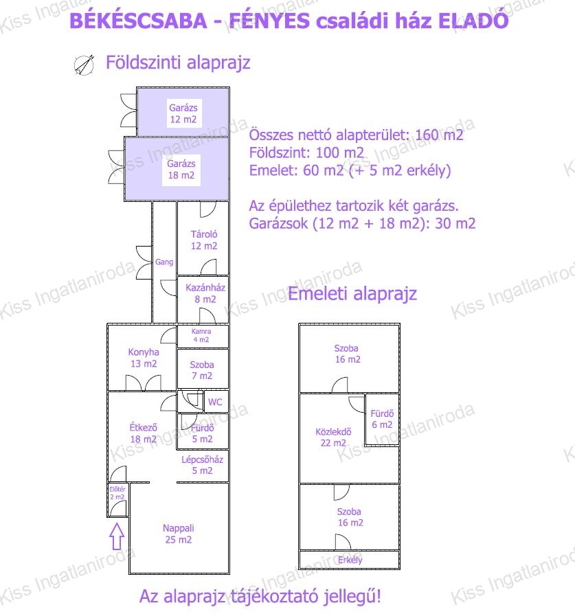 - Épület: 160 m2 + két darab 30 m2-es garázs