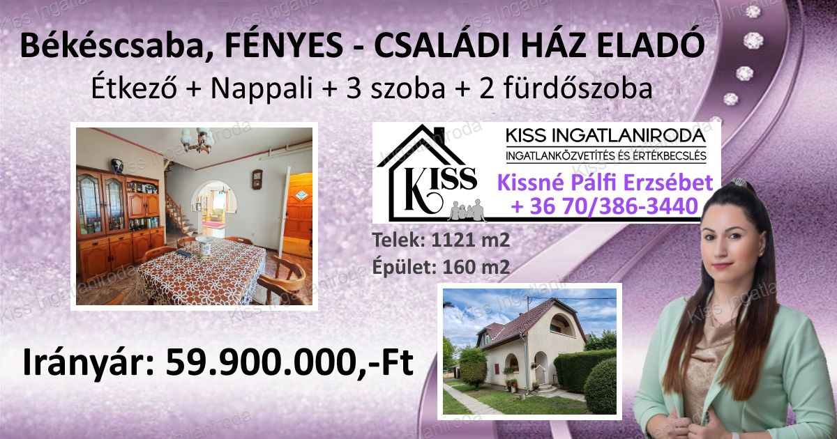 Békéscsaba Fényes városrészén eladó egy 1989-ben épült, 160 m² hasznos alapterületű családi ház 1121 m²-es telken.