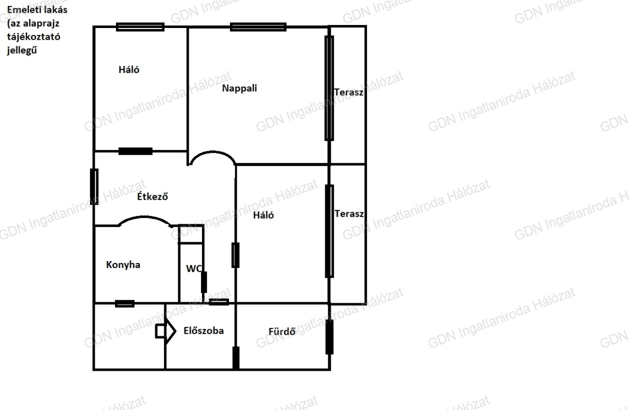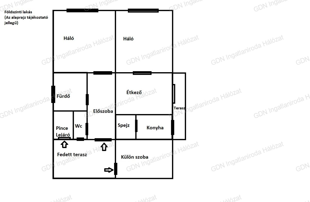 - Fedett teraszról érkezünk az előszobába, 2 szoba, étkező, konyha, spájz, kádas fürdőszoba, külön WC, és tartozik hozzá egy külön bejáratú szoba/tároló