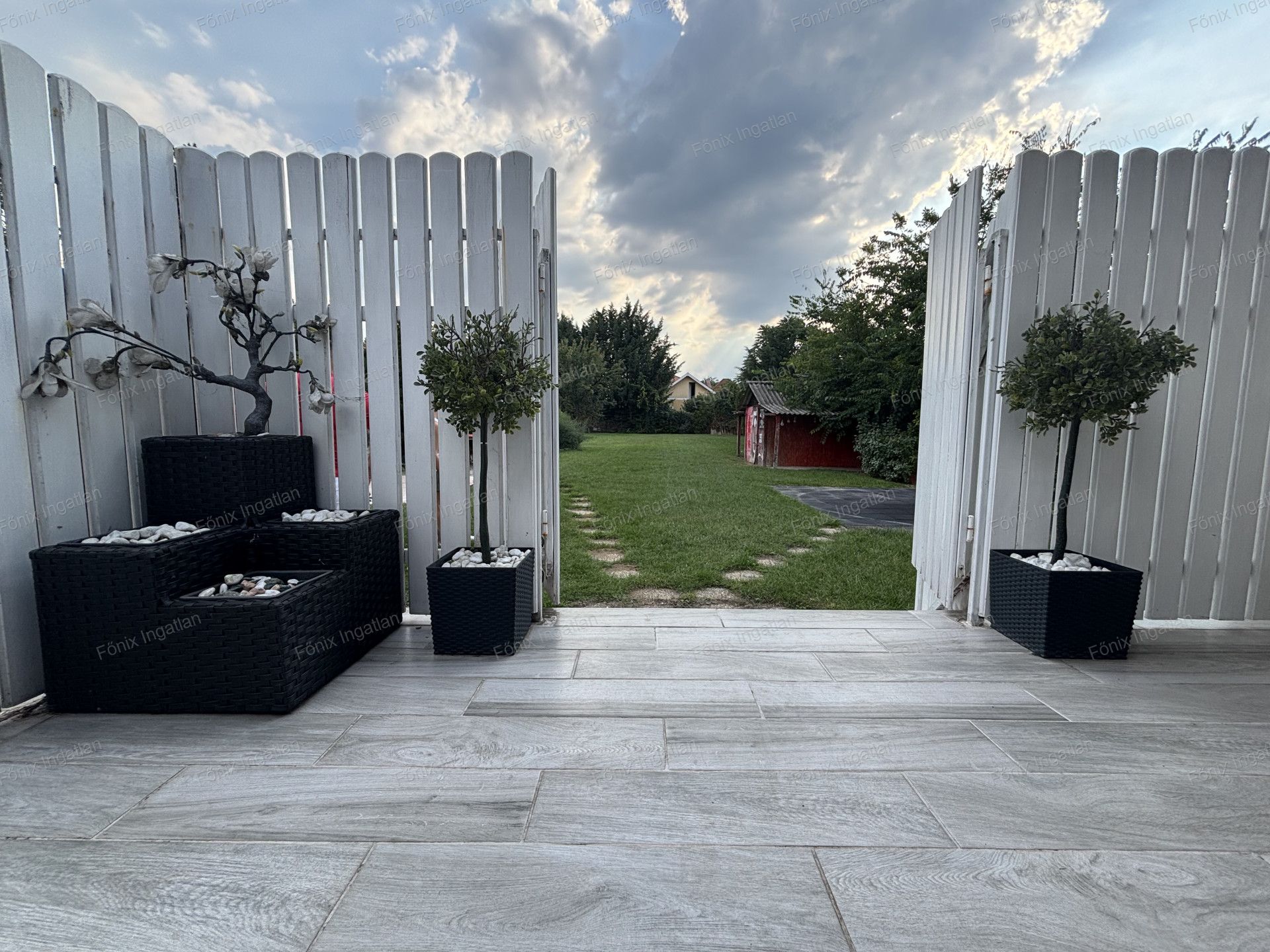 Nagy, térkövezett udvar, magas tető alatti autóbeállóval, akár több autó vagy teherautó parkolására is alkalmas