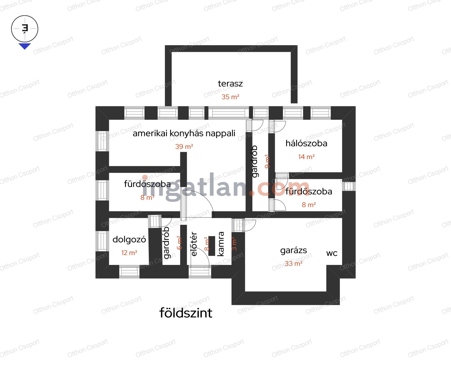 Földszint: előszoba, lépcsőfeljáró, kamra, 2 állásos garázs, gardrób (kabátok + cipők), nappali, szoba, fürdőszoba (mosókonyha), konyha, lakosztály (hálószoba, gardrób, fürdőszoba)