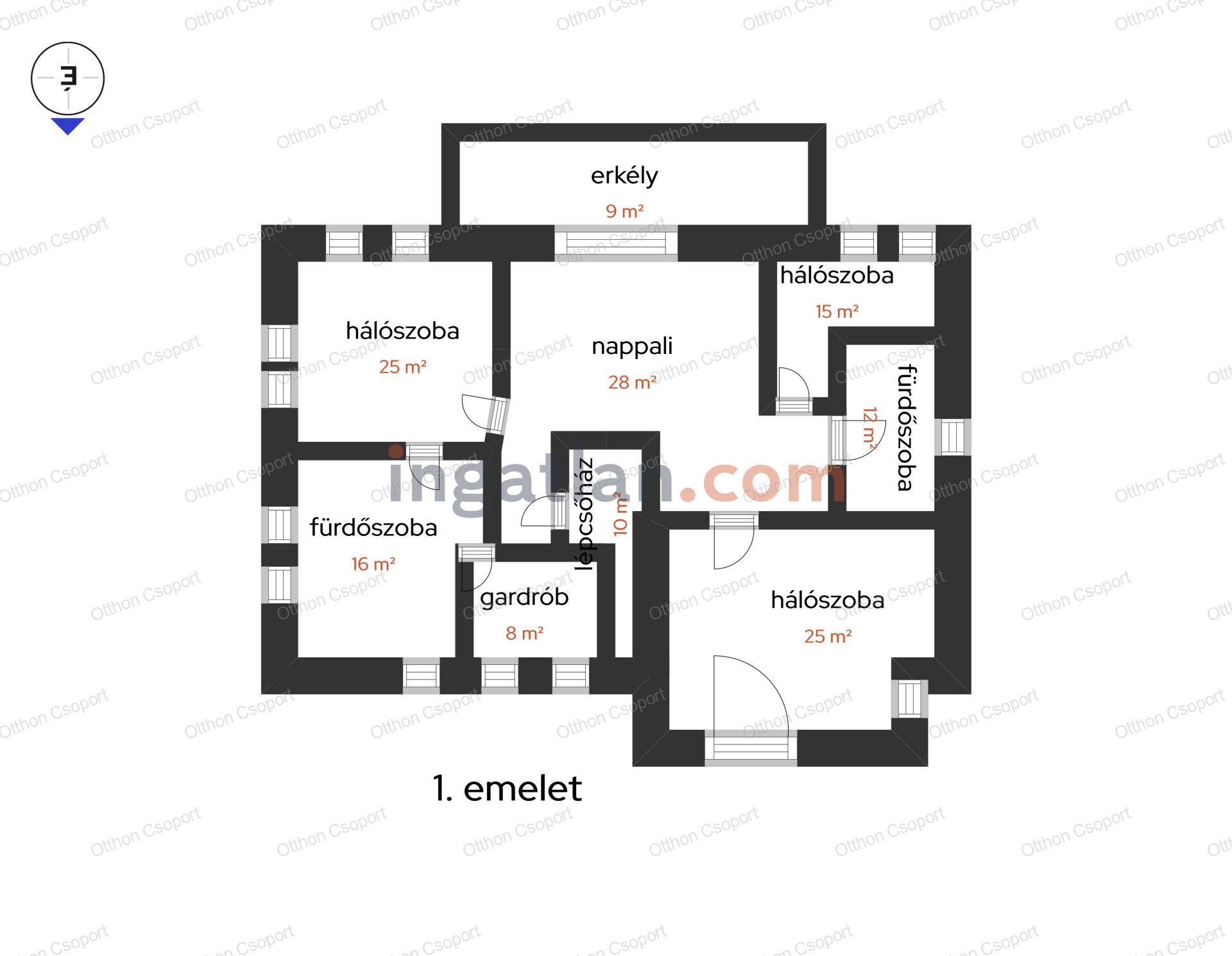 Emelet: nappali, 2 szoba, fürdőszoba, lakosztály (háló, fürdőszoba, gardrób)