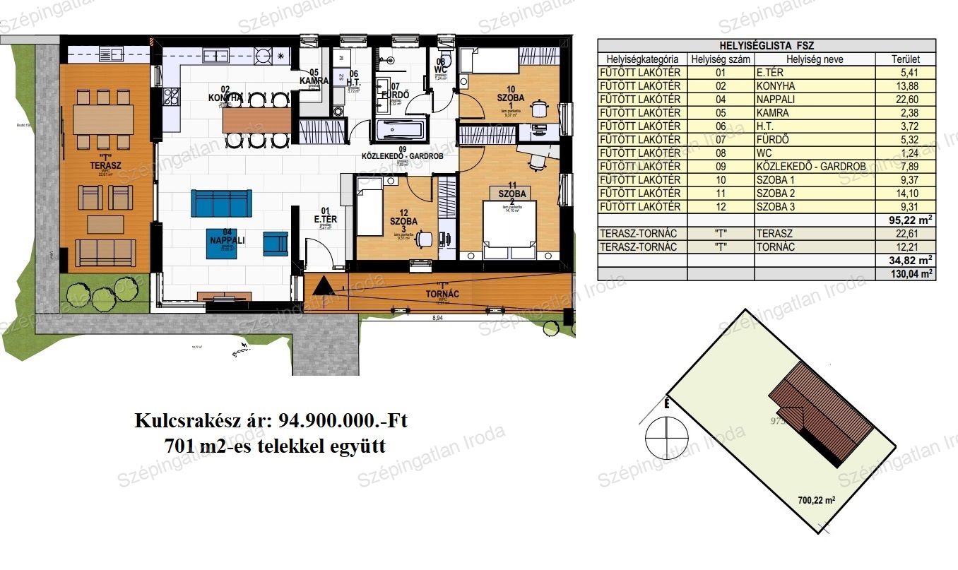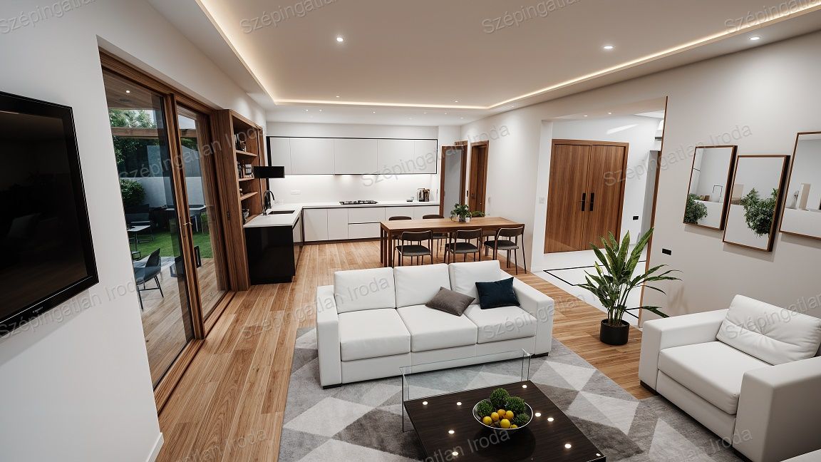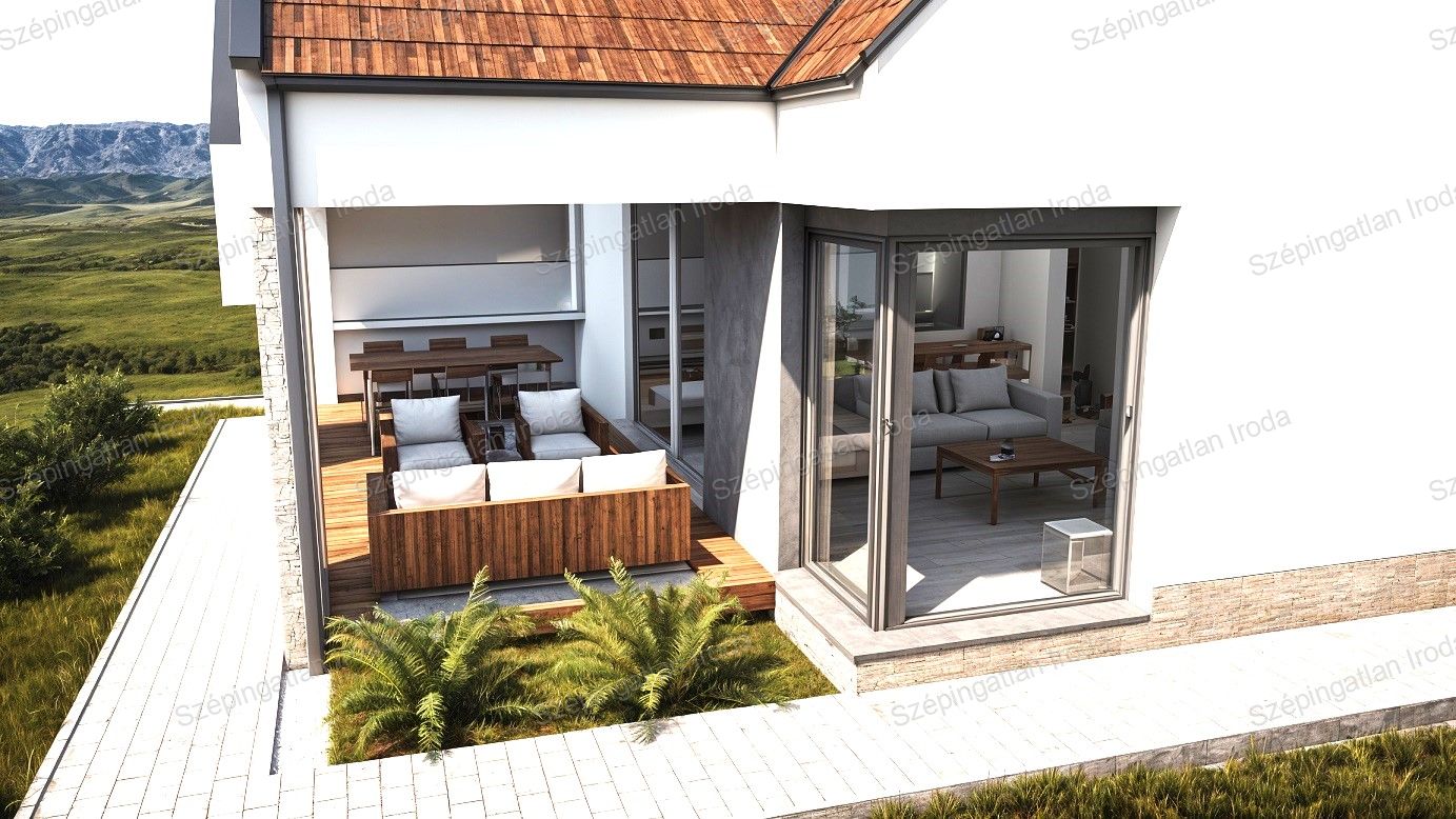 A Szépingatlan Iroda eladásra kínál Fertőszéplakon, új parcellázású területen, 701 nm-es, összközműves telekre tervezett 95 m2-es önálló családi házat. A tervezésnél törekedtek az élhető terek kialakítására és a maximális kényelem megteremtésére. Az utcában a házak az építési előírásnak megfelelően oldalhatáros rendszerben épülnek. Az alaprajzon látható belső elrendezés igény szerint módosítható: amerikai konyhás nappali 22 m2-es fedett terasz kapcsolattal, kamra, 3 szoba, fürdőszoba, vendég WC, háztartási helyiség, előszoba. Főfal szerkezete 30-as tégla, a homlokzatra 15 cm EPS dryvit hőszigetelő rendszer, 3 rétegű, fokozottan hőszigetelt üvegezésű külső nyílászárók kerülnek beépítésre, kívül színes, belül fehér kivitelben, fehér színű, műanyag redőnyökkel. A bejárati ajtó több ponton záródó biztonsági ajtó, színe a külső nyílászárókéval harmonizál. A födém szeglemezes szerkezet, a tető betoncserép fedéssel, a födémben kőzetgyapot szigeteléssel. Az ingatlanon belüli válaszfalak YTONG válaszfal lapokból készülnek, kétoldali vakolattal. A ház fűtése és a meleg víz szolgáltatás hőszivattyús rendszerrel történik. A hőleadó az egész épületben padlófűtés, mely magasabb komfortfokozatot, költséghatékonyságot és jobb bútorozhatóságot biztosít. Igény esetén értékegyeztetéssel hőszivattyús rendszer is készülhet. A festés fehér színben, hideg-meleg burkolatok, beltéri ajtók, szaniterek az építtetővel egyeztetve, meghatározott áron választhatók. Babaváró hitel, CSOK Plusz, támogatott hitelek igénybe vehetők! Bankfüggetlen szakértő kollégánk, teljes körű és díjmentes hitelügyintézéssel áll az ügyfelek rendelkezésére. Kérje személyre szabott ajánlatunkat! A projekttel kapcsolatos további kérdésekkel keresse Kollégánkat személyes találkozóra. Tervezett átadás a megrendeléstől számított 10 hónap. Az épületről látványterv készült. A teraszra tervezett fa szerkezetű árnyékoló opcionálisan kérhet. Kulcsrakész : 94,9 mFt. Érd.: +3630 520 6055, szepingatlan.eva@gmail.com