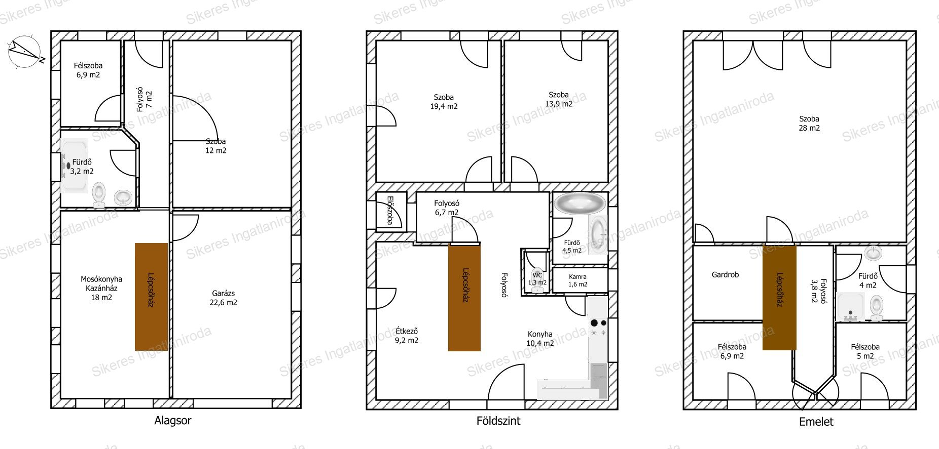 A ház elrendezése rengeteg lehetőséget rejt: a pincében garázs vagy műhely, mosókonyha, kazánház, plusz két lakótérnek használható helyiség vár. A földszinten világos, élhető terek fogadnak: két szoba, étkezős konyha, kamra, fürdő, WC és tágas közlekedő, beépített szekrényekkel. Az emeleten nagy méretű szoba, gardrób, fürdő és két félszoba kapott helyet. Az emelet belülről és kívülről is megközelíthető, így könnyedén kialakítható külön lakrész, akár kiadásra, akár több generáció együttélésére.