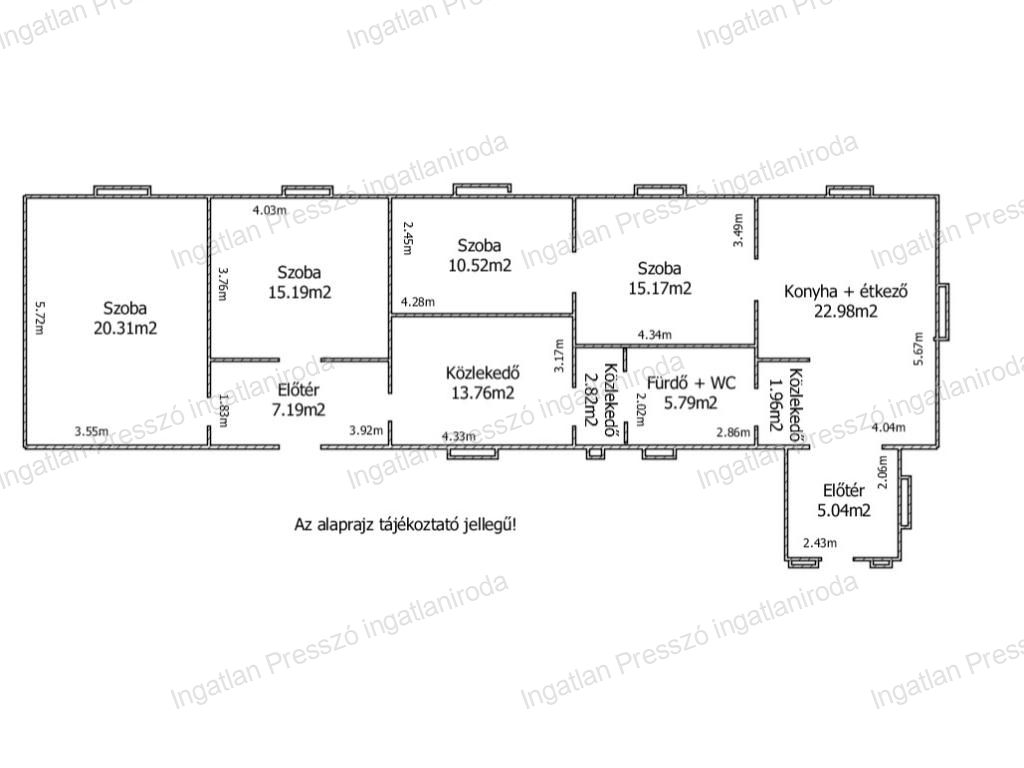 - 4 szoba, egy fürdőszoba káddal és wc-vel, előtér, közlekedő, és egy amerikai konyhás nappali található még a házban