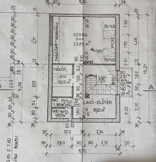 Az emeleti szinten (bruttó 49,3 m2): közlekedő, nagyméretű szoba, hálófülke, wc + zuhanyzó található.