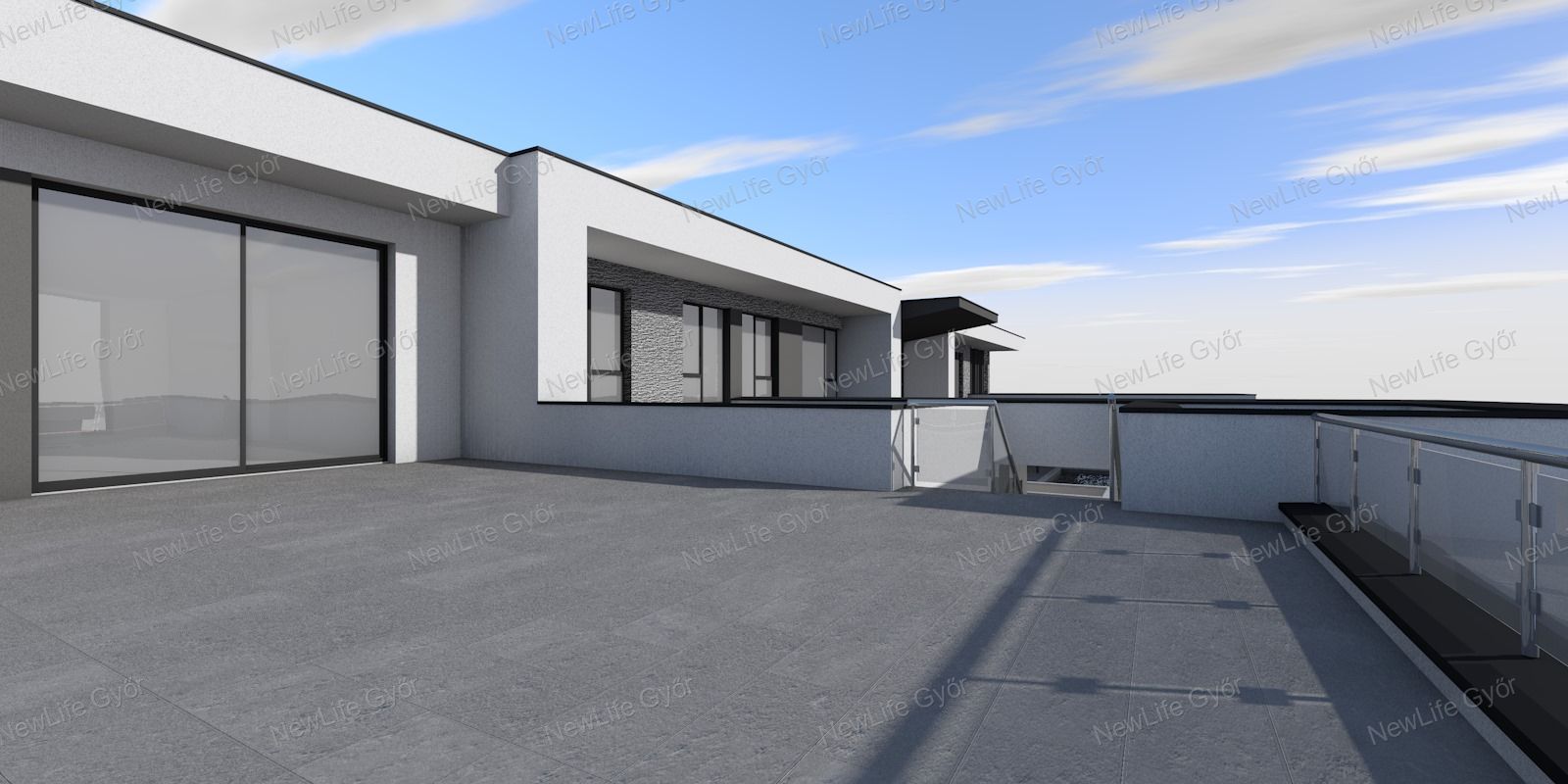 A 110 m²-es panorámás terasz a villa ékköve: jakuzzi, szauna és pihenőzóna vár itt, miközben a Pannonhalmi dombság és Győr látványa tárul eléd.