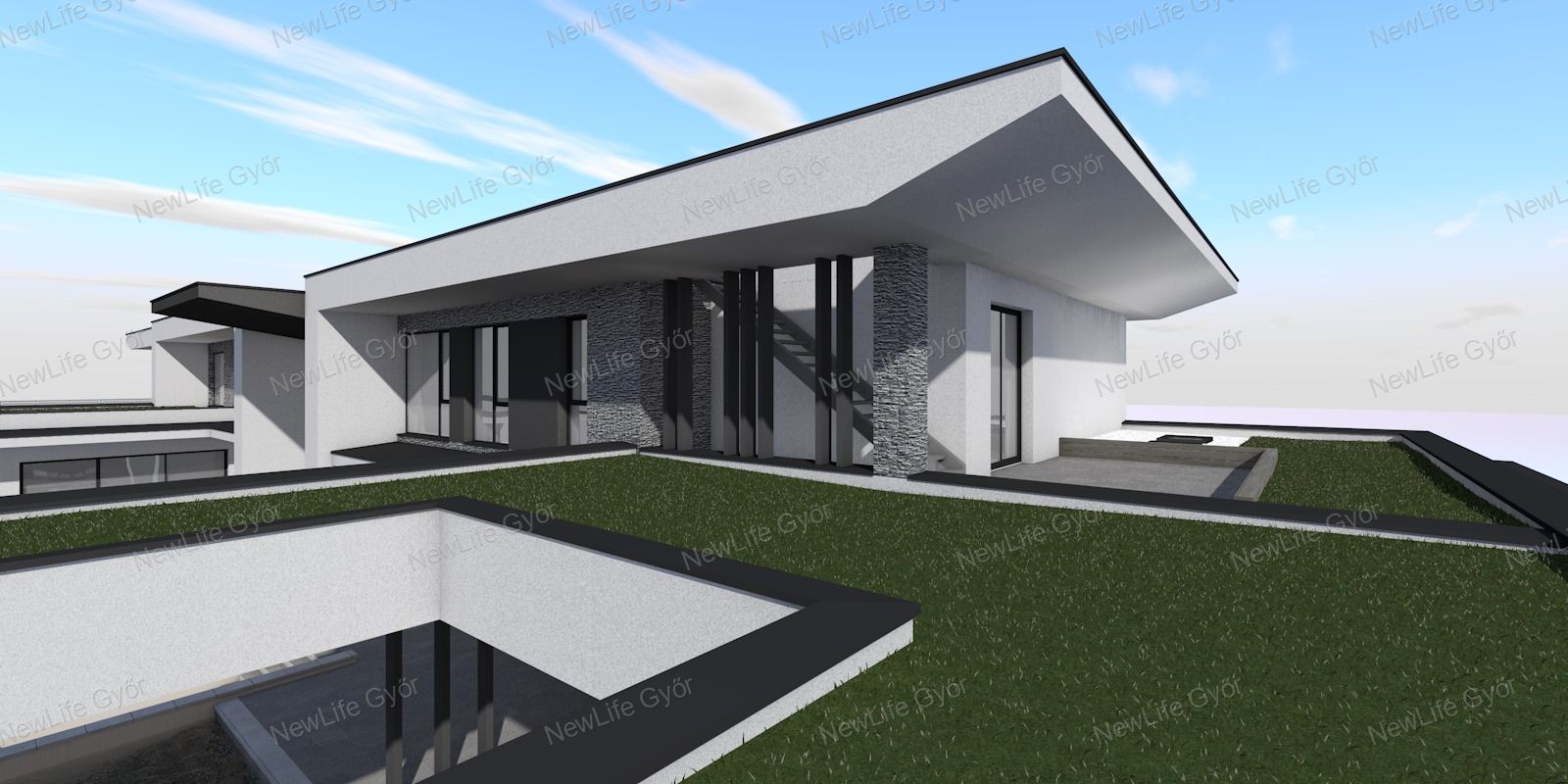 A modern tetőszigetelés, az antracit színű, háromrétegű nyílászárók és a masszív statikai alapok hosszú távra tervezett biztonságot nyújtanak.