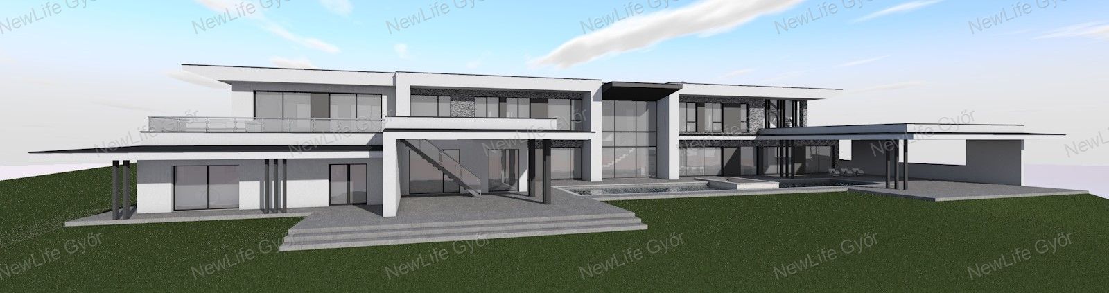 A 110 m²-es panorámás terasz a villa ékköve: jakuzzi, szauna és pihenőzóna vár itt, miközben a Pannonhalmi dombság és Győr látványa tárul eléd.