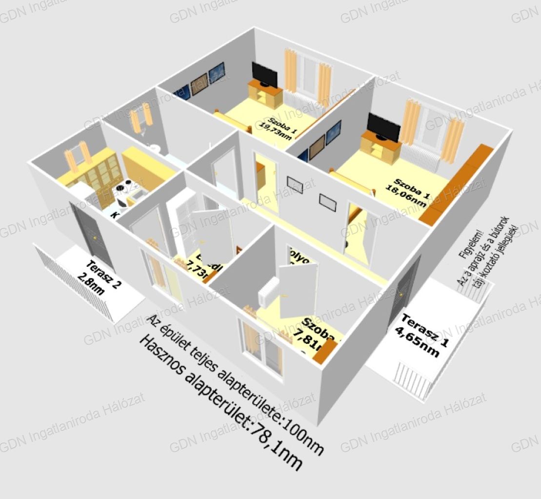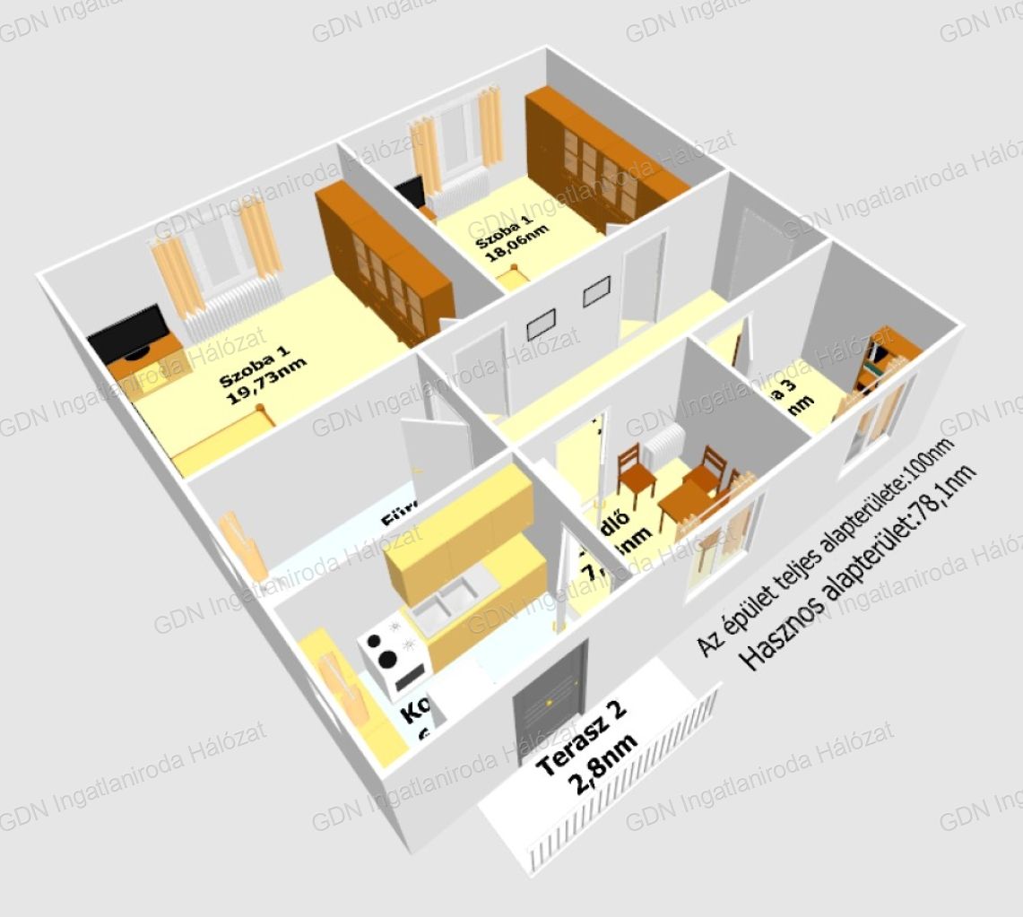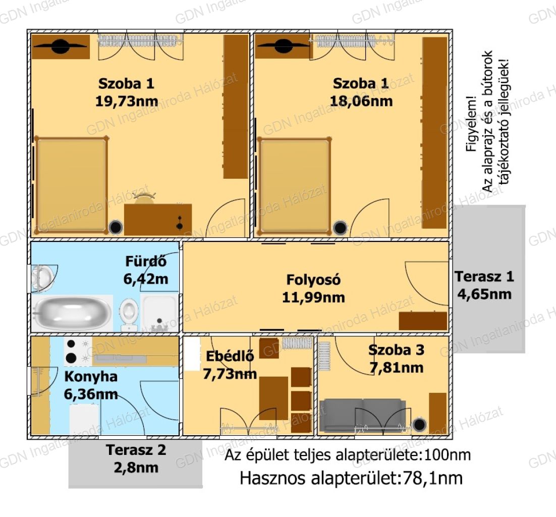 A főépület hasznos alapterülete 78,1nm melyben található: