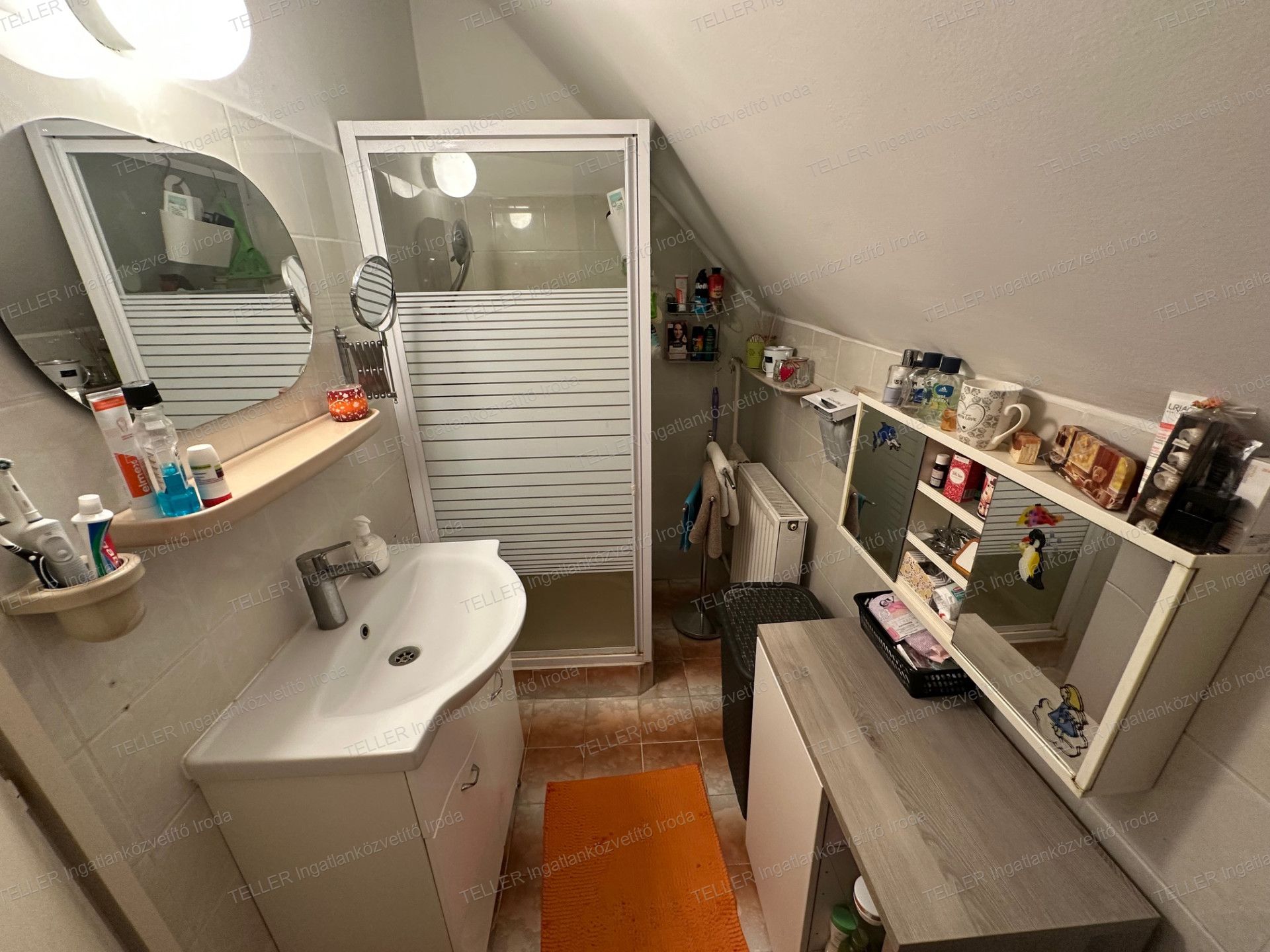 A felső szinten található egy közlekedő, konyha, kamra, lépcsőház, 3 db szoba, fürdő+Wc, mosókonyha, erkély.