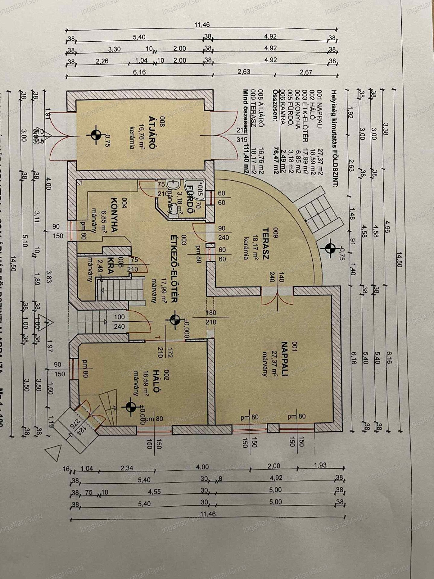-Földszint: nappali + konyha étkezővel kamrával + 1 szoba gardrobbal és vizes blokkal, ( ami akár vállalkozásnak is alkalmas, külön bejárattal) + fürdő wc-vel + 18 nm-es terasz + garázs