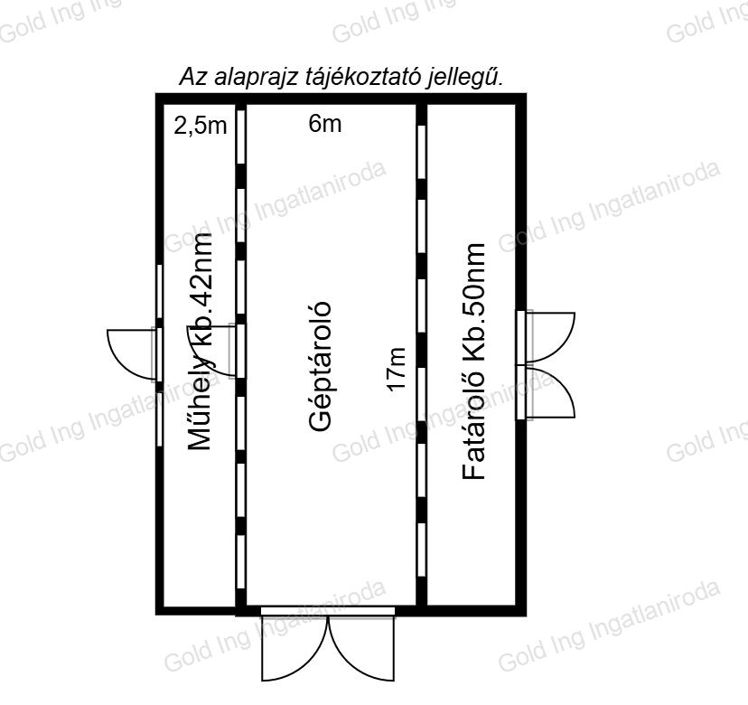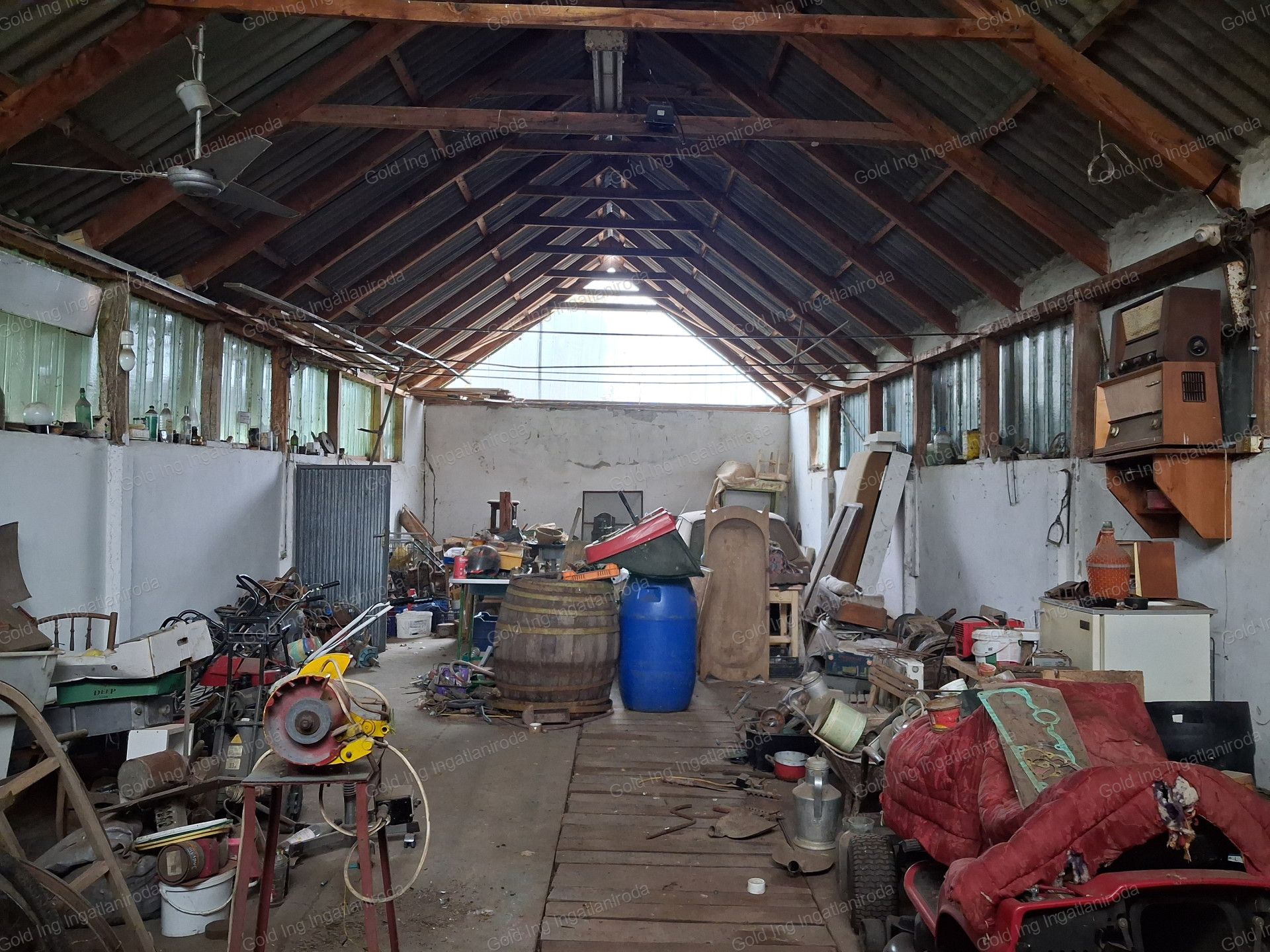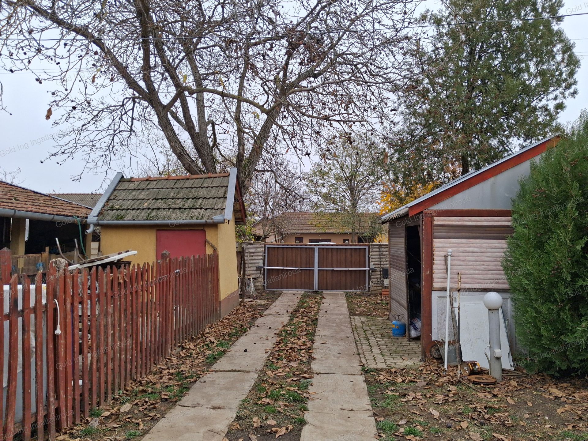 A hátsó, aszfaltozott udvar az utcáról két nagykapun közelíthető meg. Így nagy gépekkel is átjárható, nem kell forgolódni, tolatni velük. Erre az udvarra épült a különösen nagy értéket képviselő 102 nm-es géptároló. Mezőgazdasággal, fuvarozással, vagy traktorok, teherautók javításával foglalkozó vállalkozóknak lehet megfelelő pont így, ebben a formában. Nagy belmagasságú (6 méter), magasított ajtóval (ponyvás teherautó is befér) szabványos szerelőaknával van ellátva. Az aljzat 1/3-a szigetelt, 400 mázsa szemes takarmány tárolására is alkalmas, és még akkor is marad bőven hely mellette más célra. A géptároló mindkét oldalán, a tető továbberesztésével két nagy helyiséget nyertek. Egy 42,5 nm-es műhelyet, szerszámost, és egy 50 nm-es tüzelőtárolót. Az itt elhelyezett 5-10 évre elegendő tüzifa ajándékba maradhat.