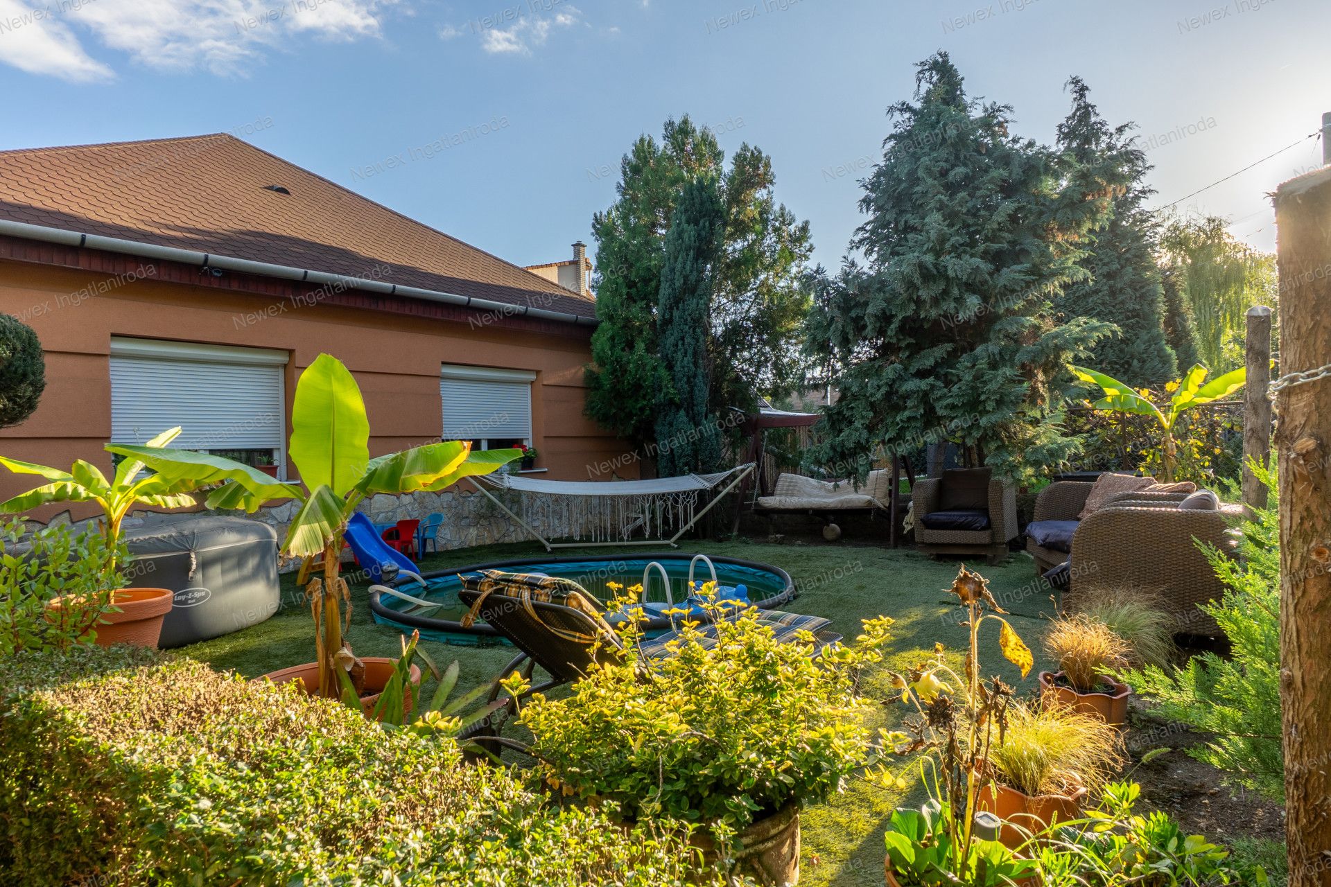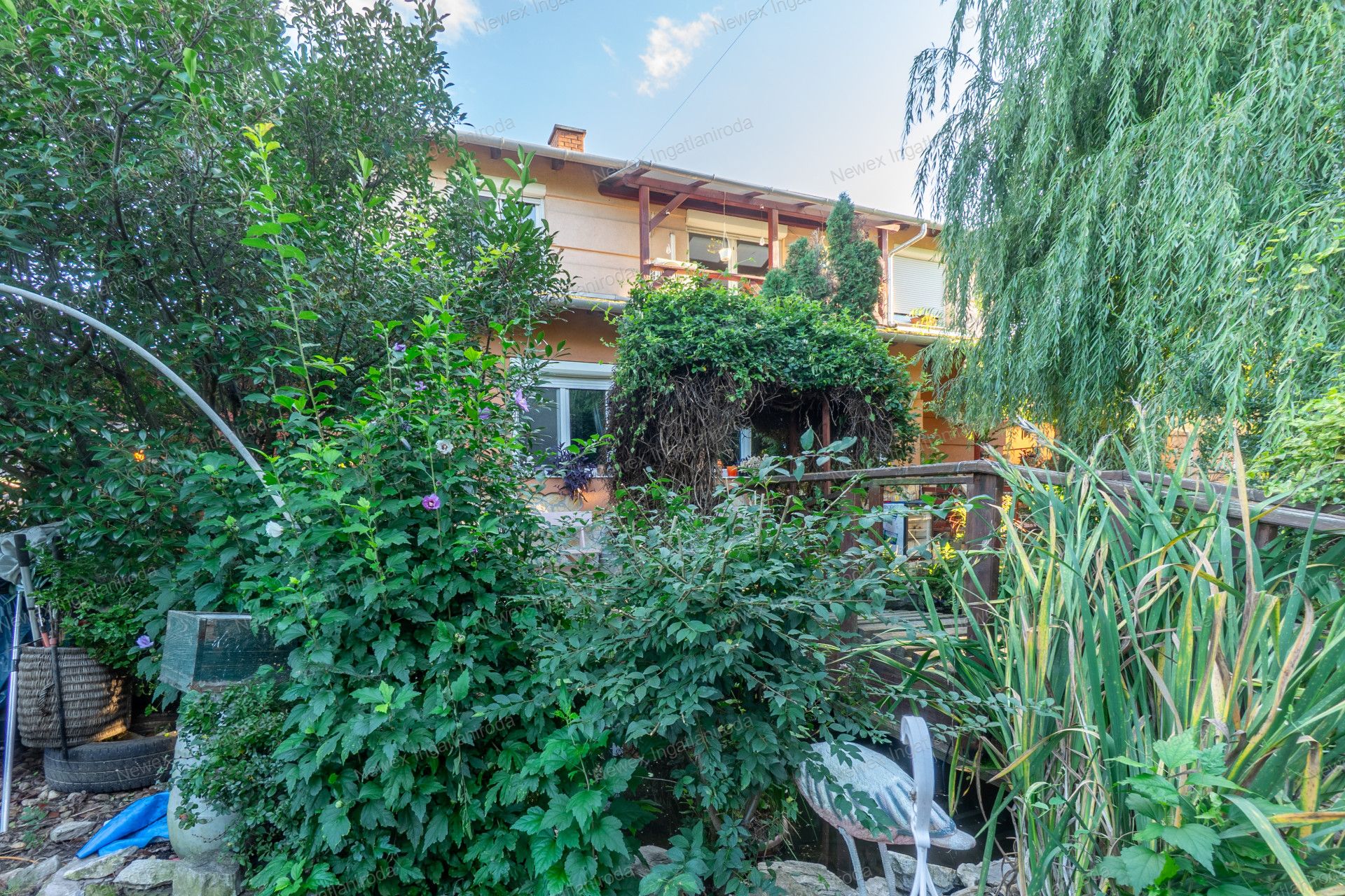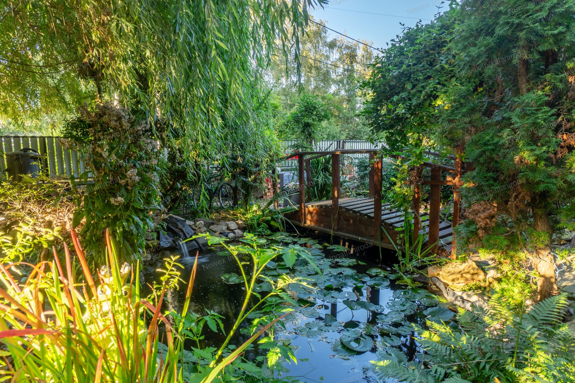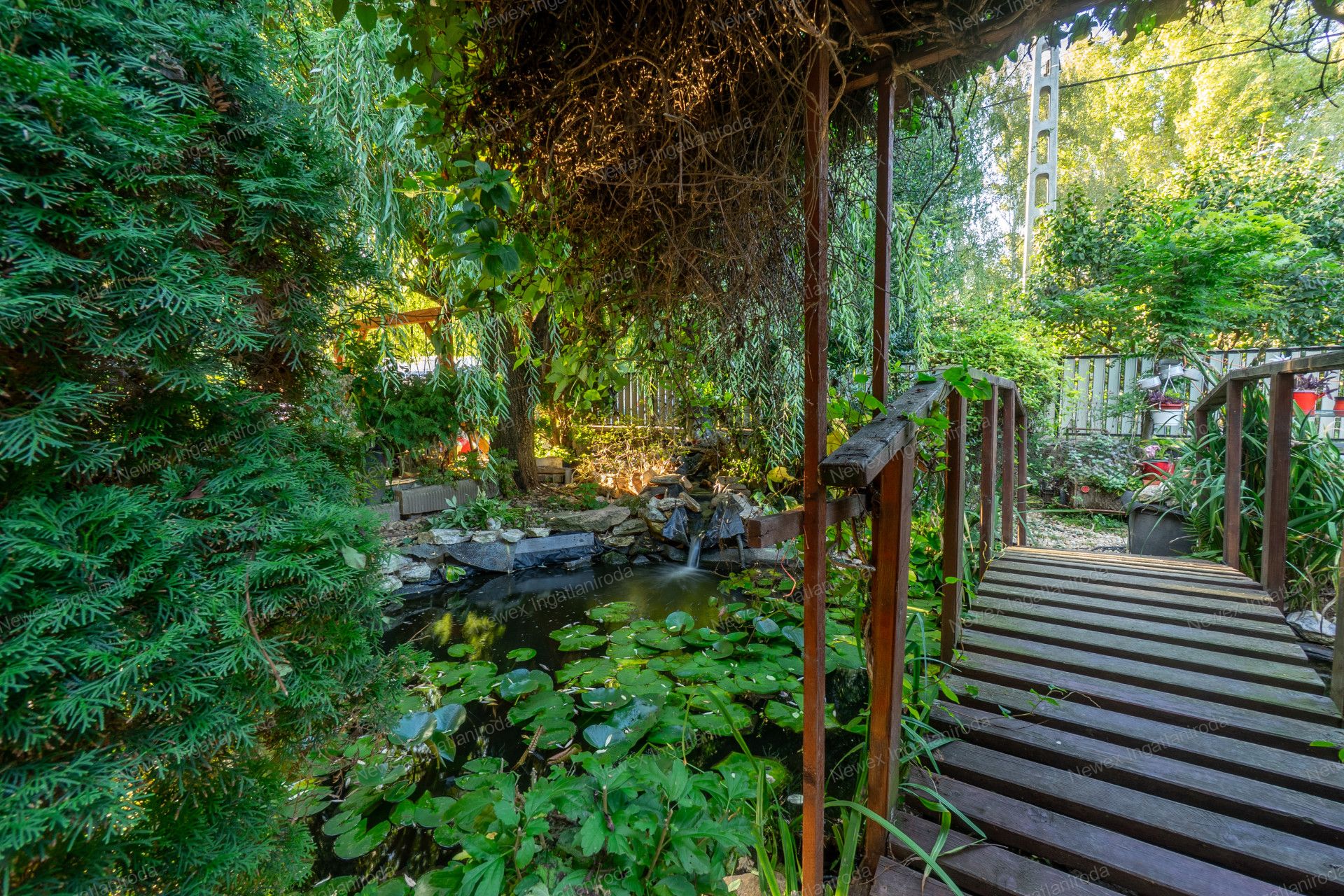A szépen parkosított, arborétum hangulatú kertben egy kis halastavat is kialakítottak, amin egy híd is átível, és egy jól kiépített szalonnasütő is biztosítja a háziak, illetve a vendégeik kikapcsolódását.