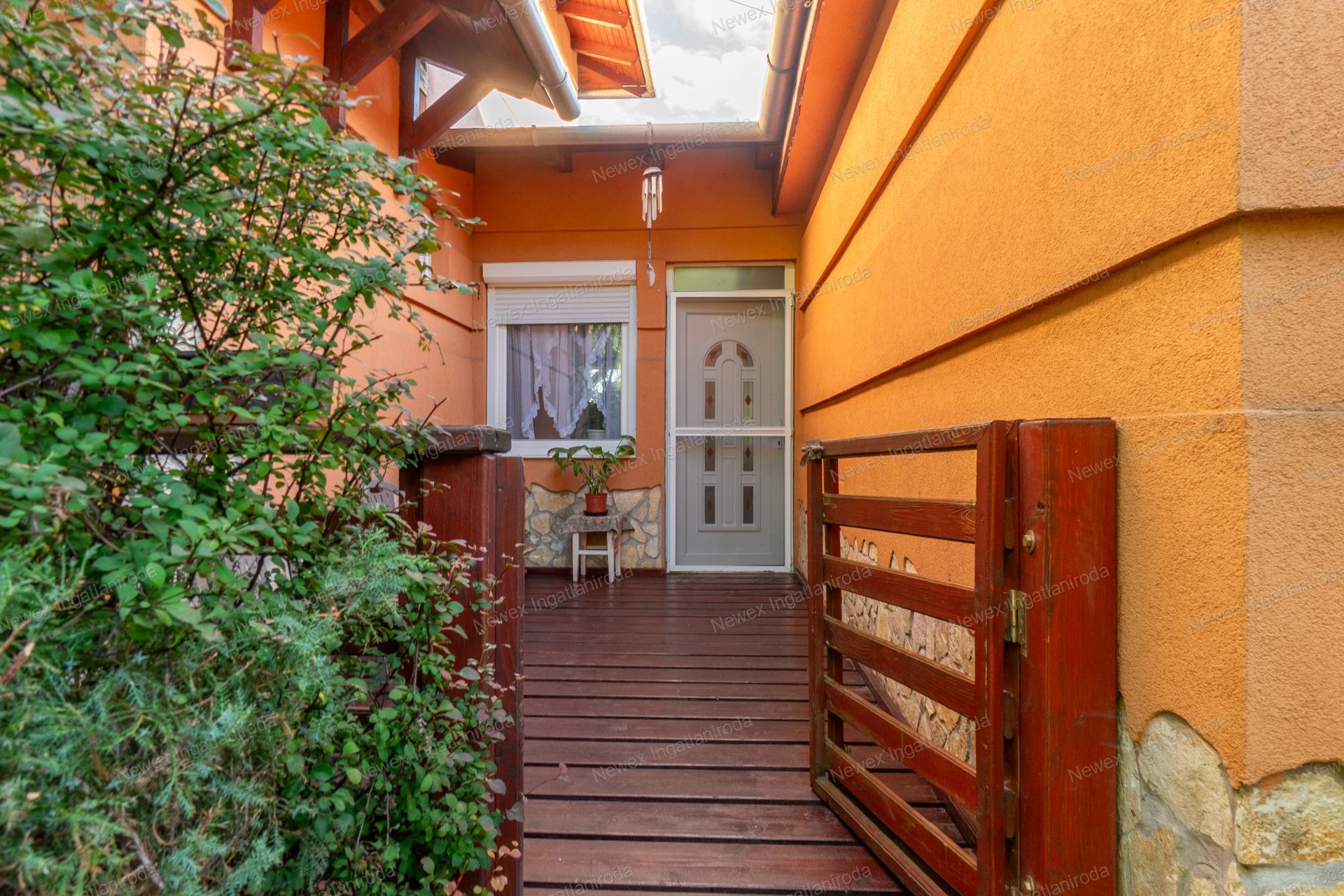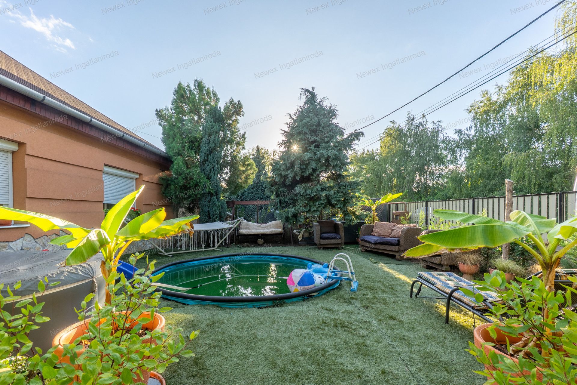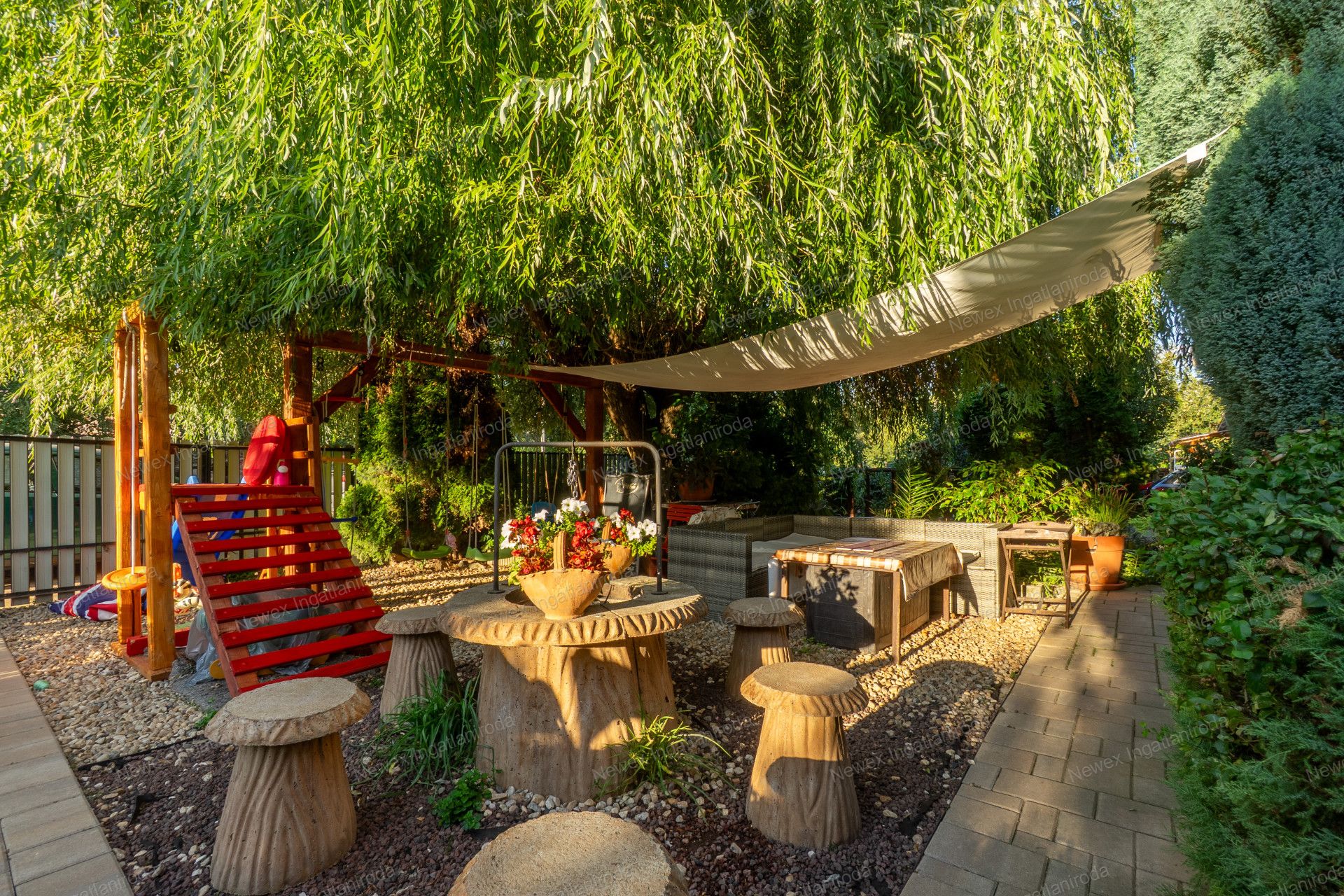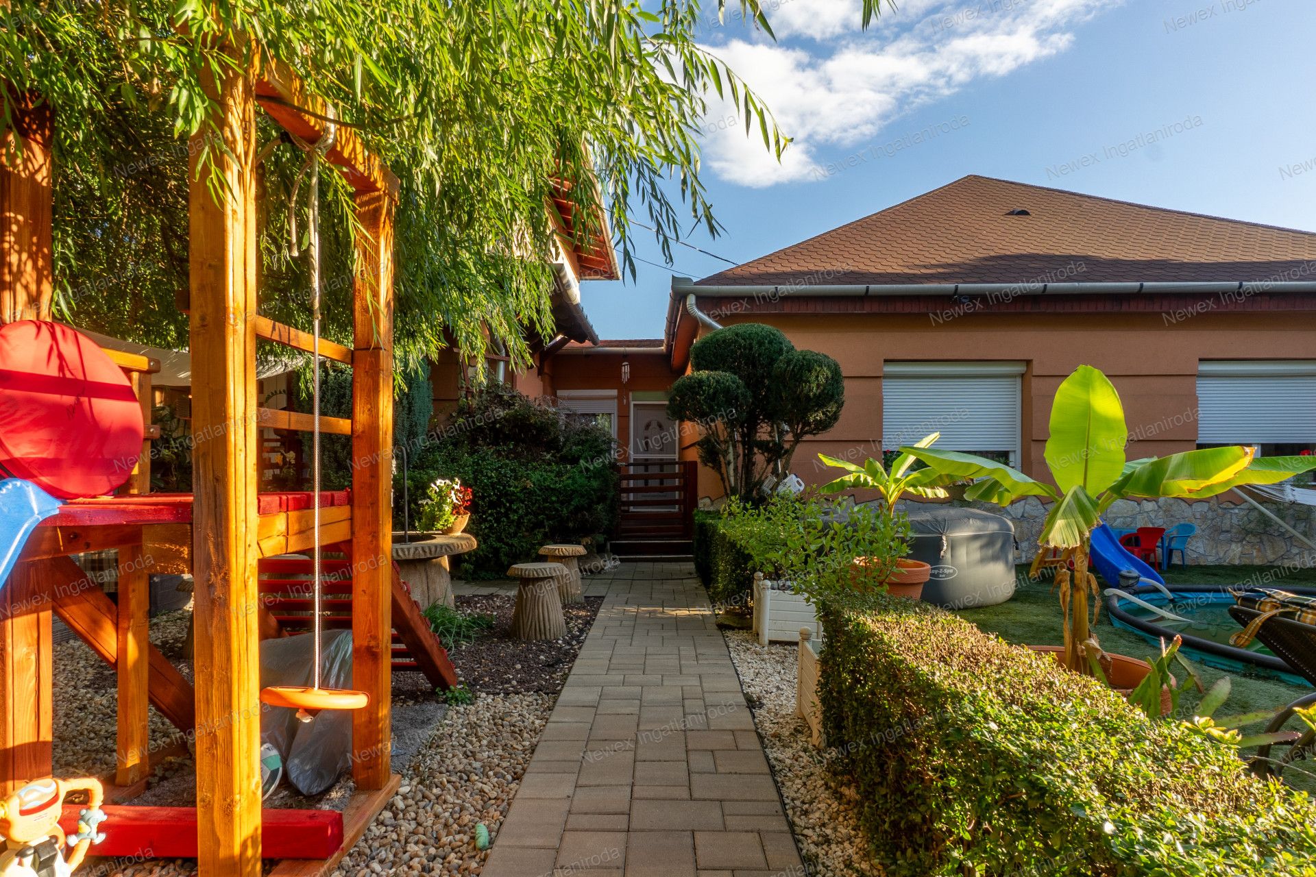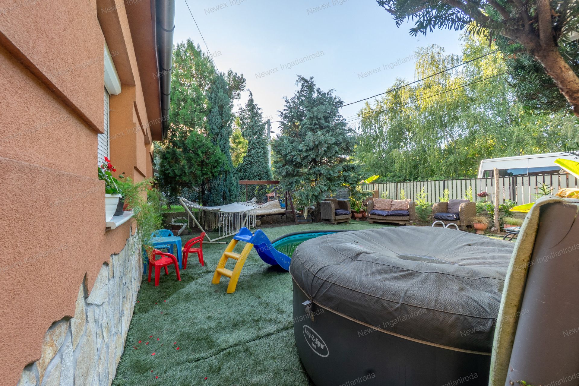 A szépen parkosított, arborétum hangulatú kertben egy kis halastavat is kialakítottak, amin egy híd is átível, és egy jól kiépített szalonnasütő is biztosítja a háziak, illetve a vendégeik kikapcsolódását.