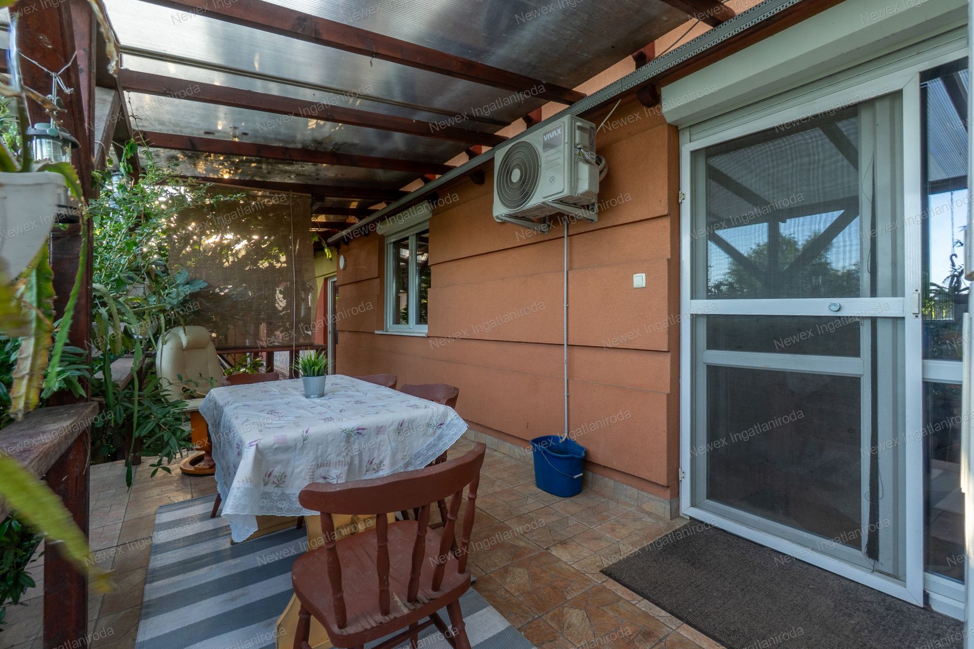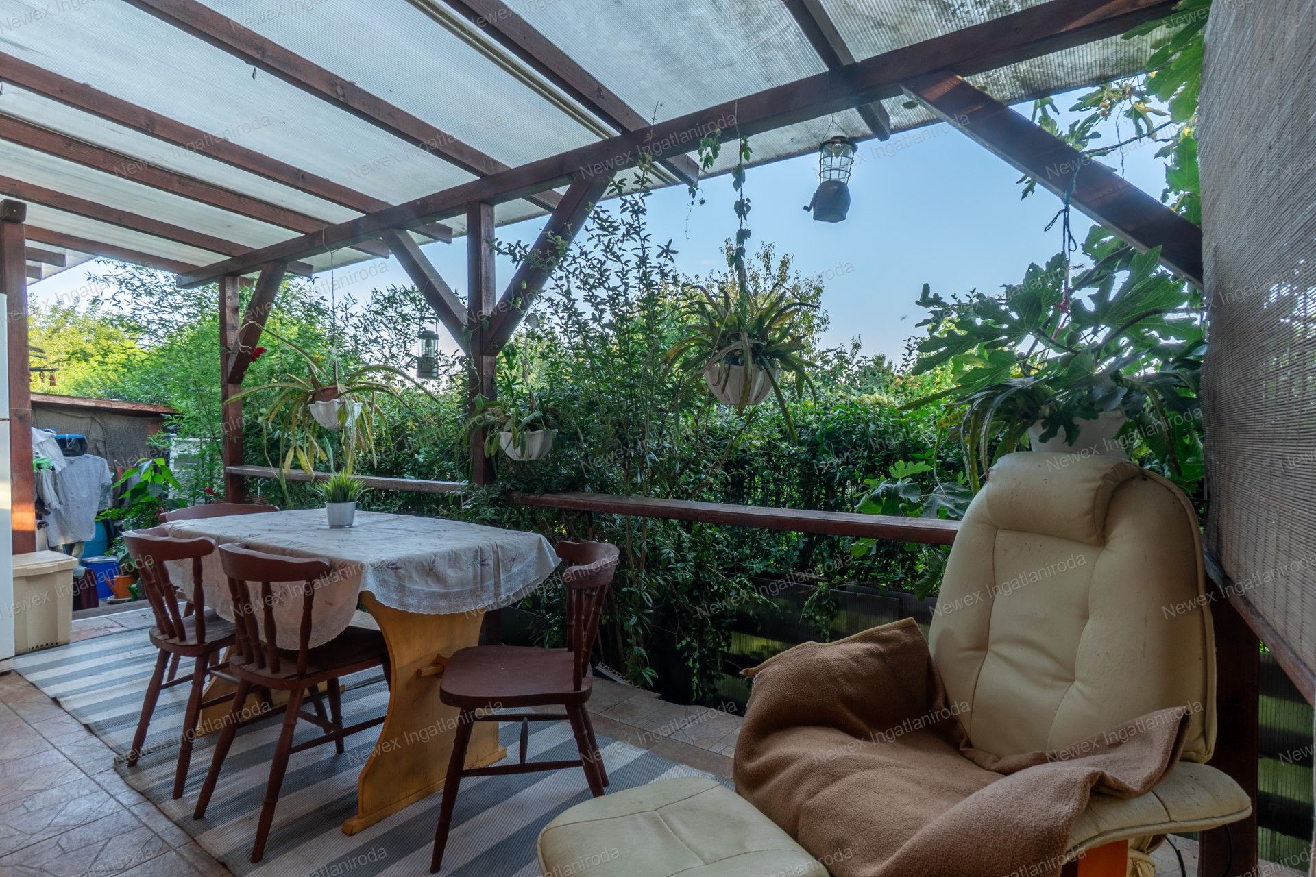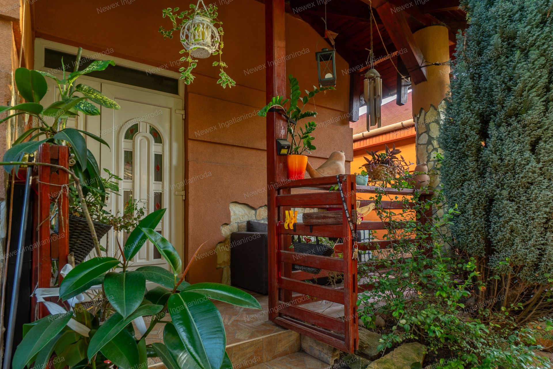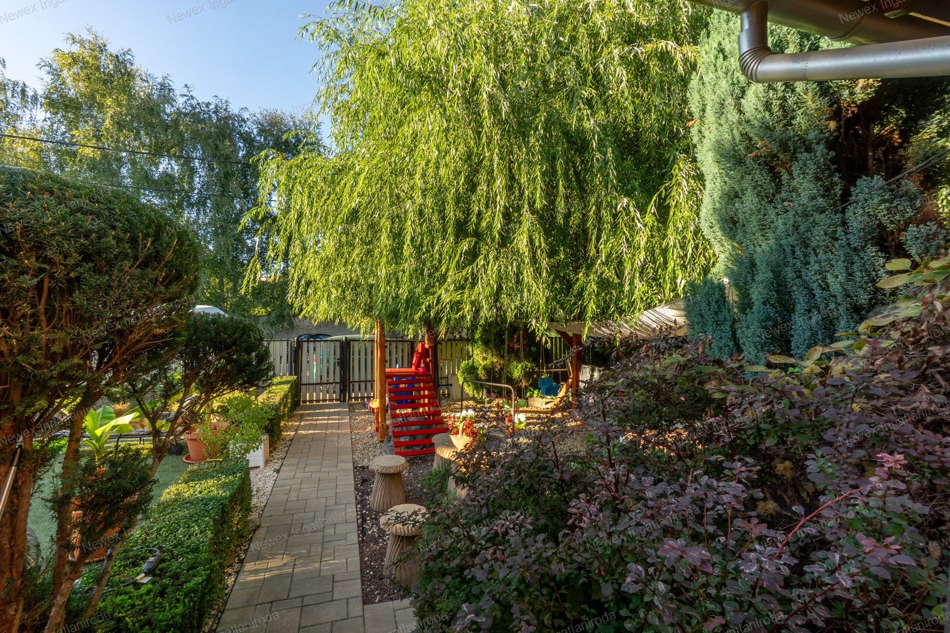 A szépen parkosított, arborétum hangulatú kertben egy kis halastavat is kialakítottak, amin egy híd is átível, és egy jól kiépített szalonnasütő is biztosítja a háziak, illetve a vendégeik kikapcsolódását.