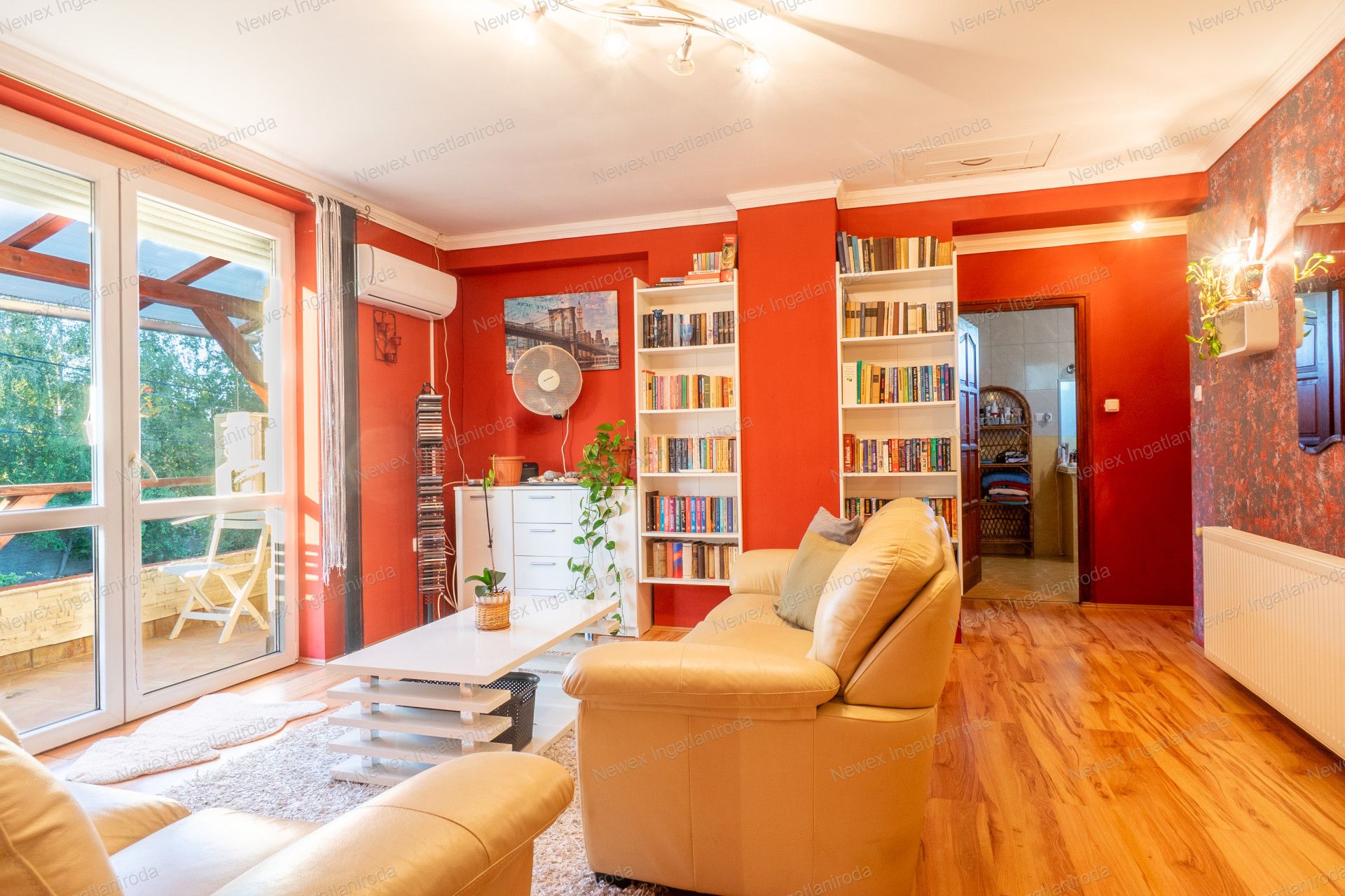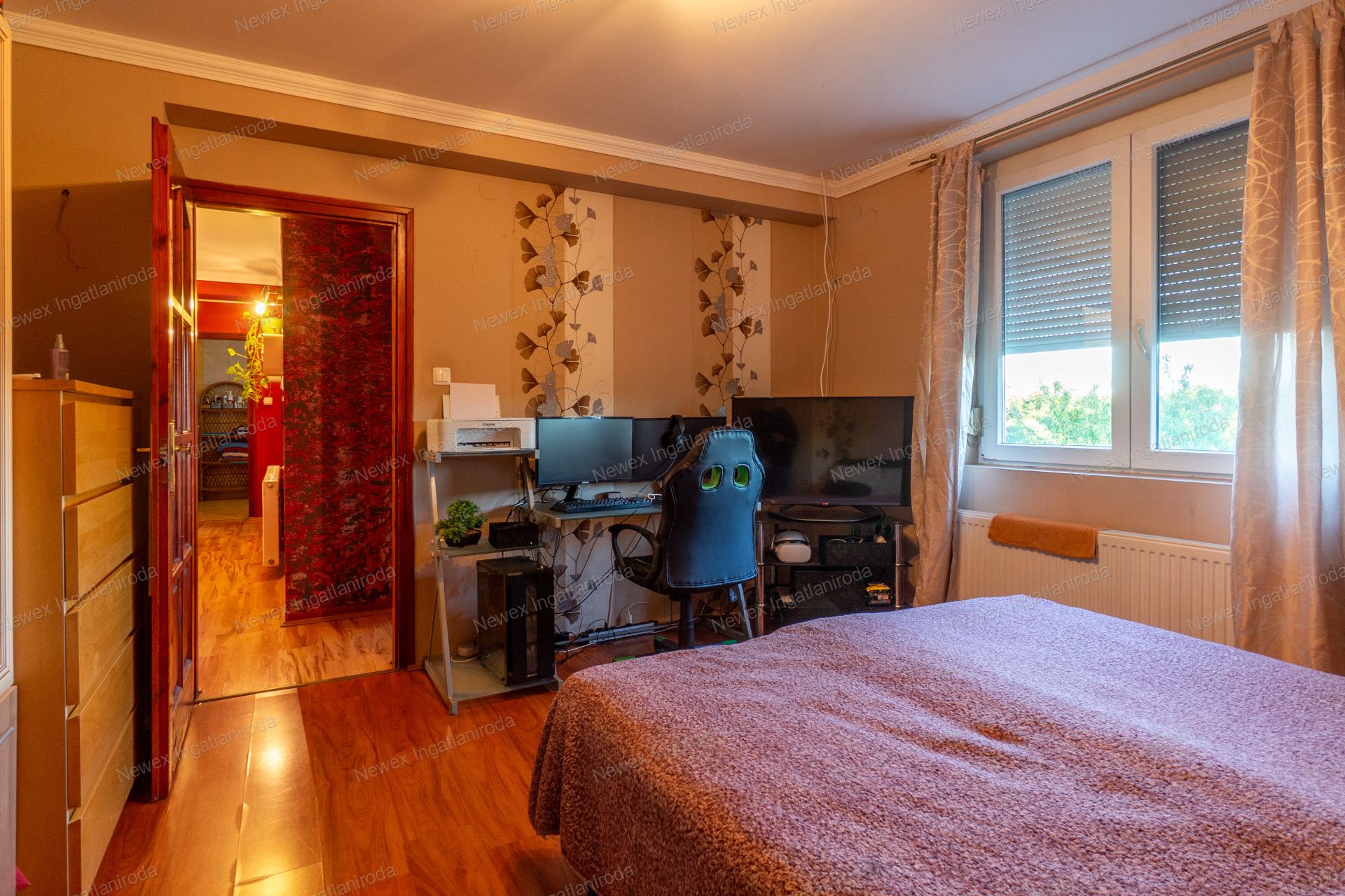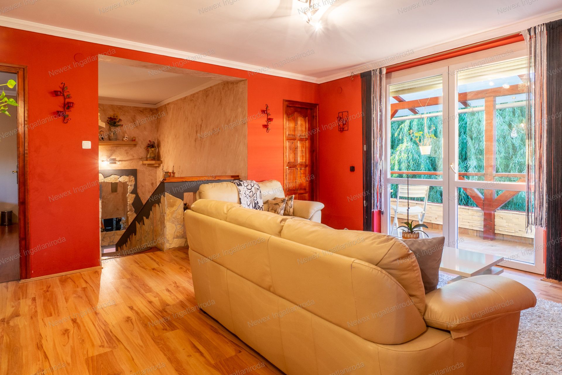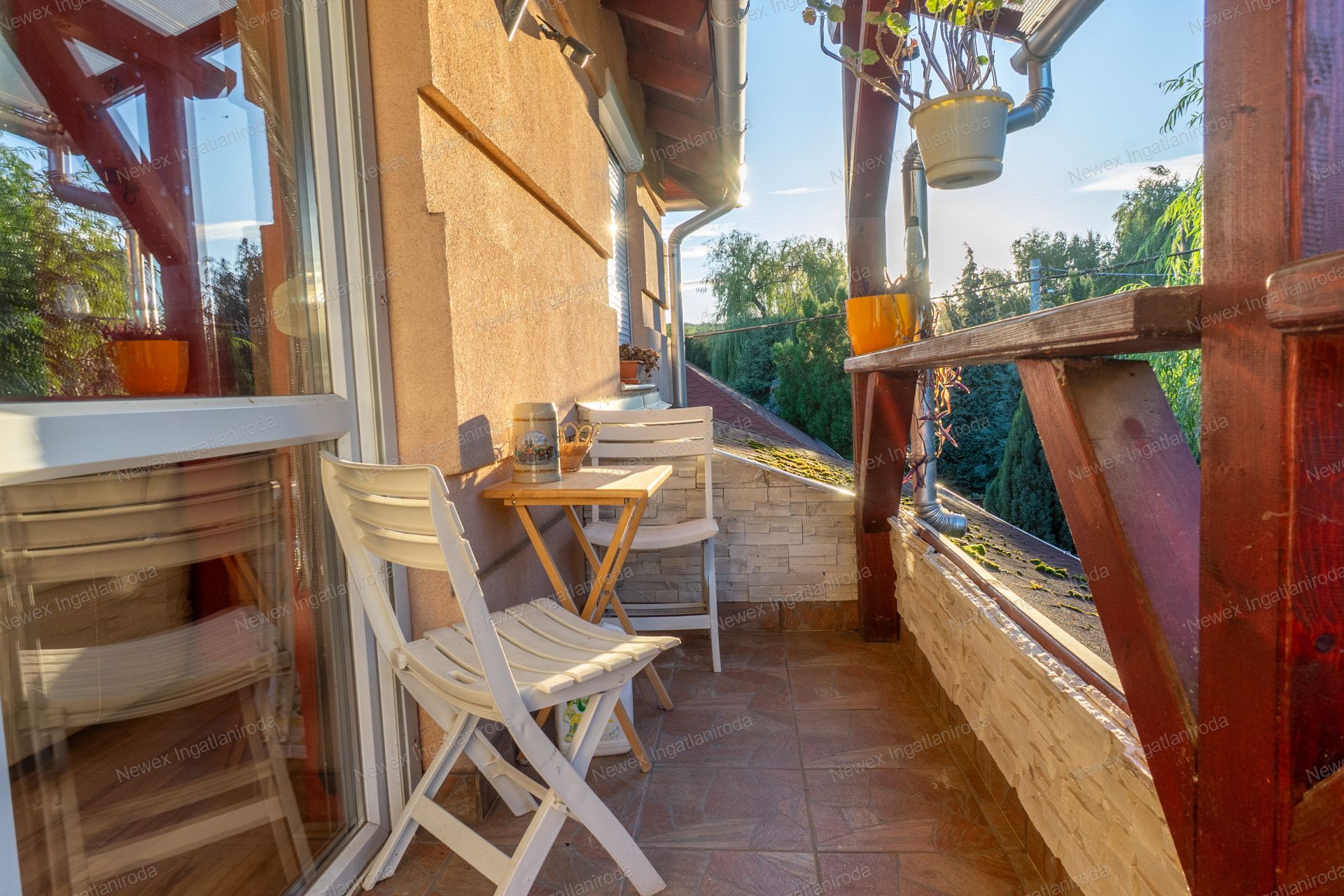 Az emeleten szintén egy nappali, valamint 2 hálószoba és egy gardrób található, és ezen a szinten is van fürdőszoba, WC-vel. A nappaliból nyílik egy erkély, ahonnan remek kilátás nyílik a kertre.