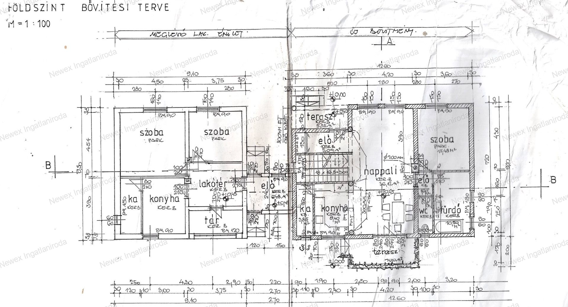 A új épületben a földszinten egy előtér, egy nagy nappali, étkezővel, egy hatalmas konyha, egy hálószoba, valamint egy duplamosdós, sarokkádas fürdőszoba és egy külön WC található. A nappaliból lehet kijutni a 28 négyzetméteres fedett teraszra.