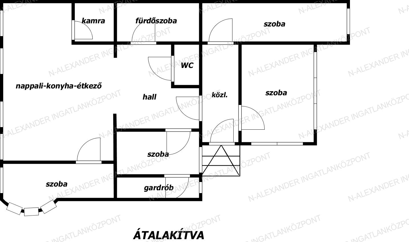 A szobák mérete és belmagassága sok lehetőséget kínál azoknak akik egy szellős amerikai konyhás tágas nappaliban gondolkoznak, és mellette még 3 hálószoba is kialakítható. Mellékelek egy átalakítási elképzelés alaprajzát. Természetesen más megoldások is szóba jöhetnek, akár két lakrész kialakítása is elképzelhető, az ingatlannak jelenleg is két bejárata van.