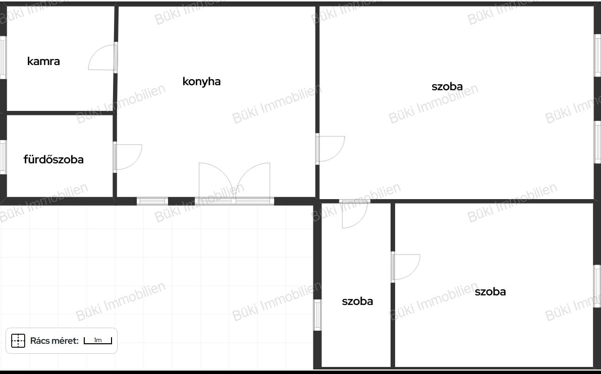 A ház elrendezése átgondolt és jól kihasználható: a tágas konyha központi helyen található, innen nyílik a kamra és a fürdőszoba, illetve a legnagyobb nappali-szoba, ami akár étkezővel is összenyitható. A nagyobb szoba mellett két kisebb helyiség is található, így három külön szobája révén ideális választás lehet családosoknak, otthonról dolgozóknak. A szobák világosak, a belmagasság kellemes, a terek szellősek, igazi régi polgári hangulatot árasztanak.