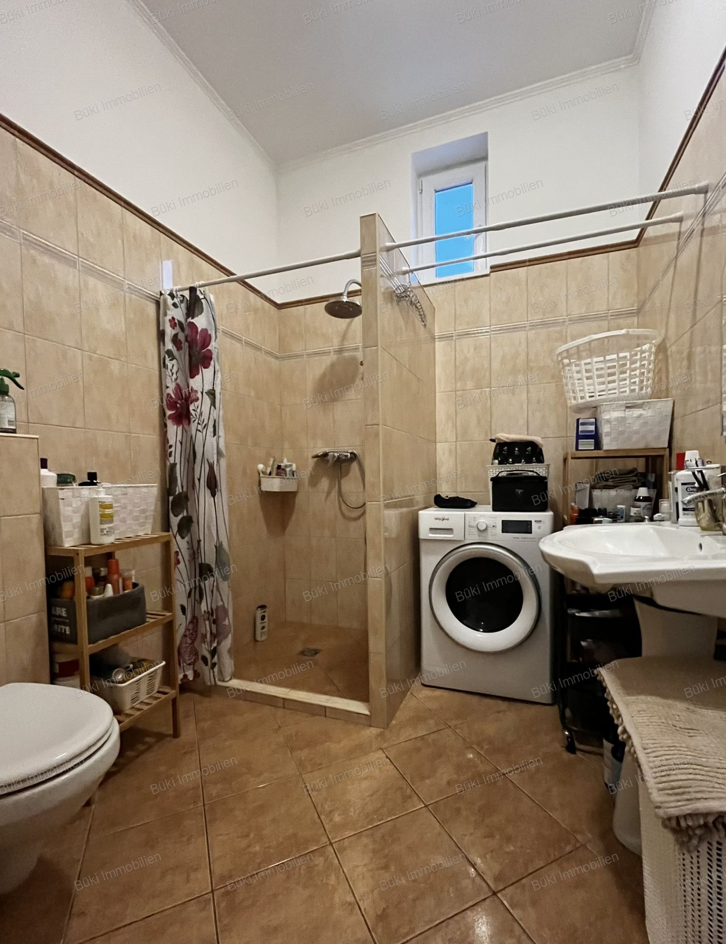 A fürdőszoba felújítása során modern burkolatok és praktikus elrendezés került kialakításra. A meleg vizet és a fűtést BOSCH kombi kazán biztosítja, emellett a pincében egy vegyes tüzelésű kazán is rendelkezésre áll — ez nagy érték a mai energiaárak mellett, és alternatív fűtési lehetőséget kínál.