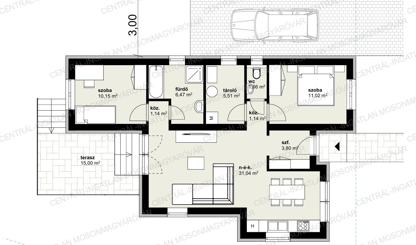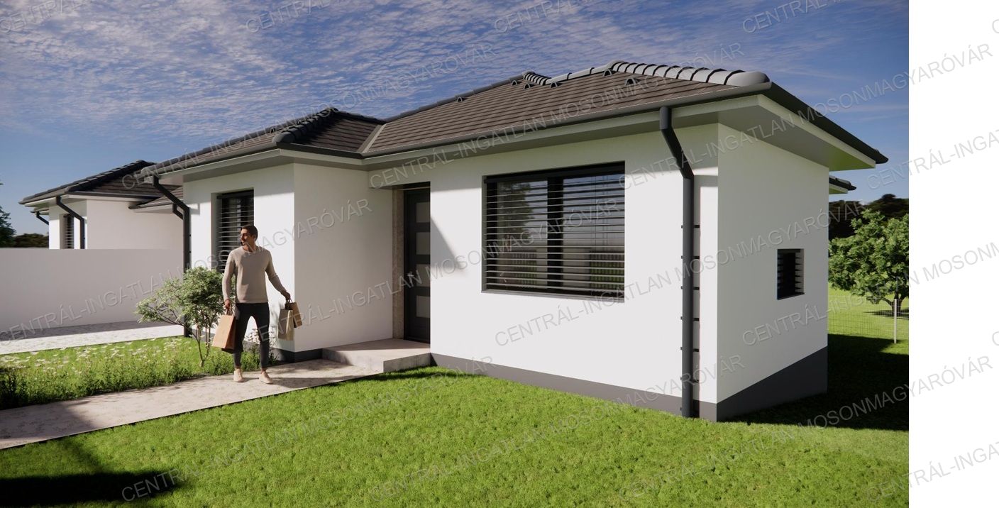 -A ház formája modern, letisztult stílusú tervezés eredménye. A belső elosztás is rendkívül ideális. A földszintes házban megtalálható a nappali-étkező-konyha mellett 2 tágas hálószoba, továbbá nagy méretű fürdő, önálló wc-vel és előszoba helyiség is.