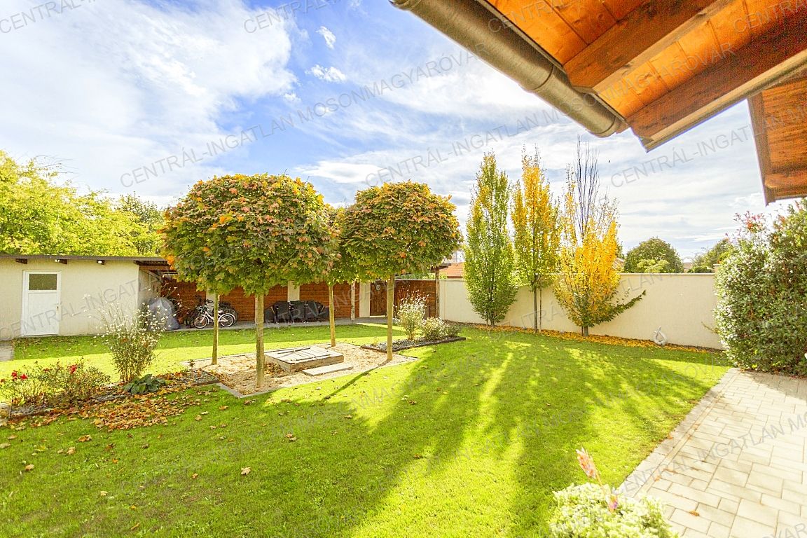 -A kert gyönyörűen parkosított, öntözőrendszerrel egy 30m2-es kerti házzal (műhely, tároló), mellette egy nagy, fedett grillterasszal.