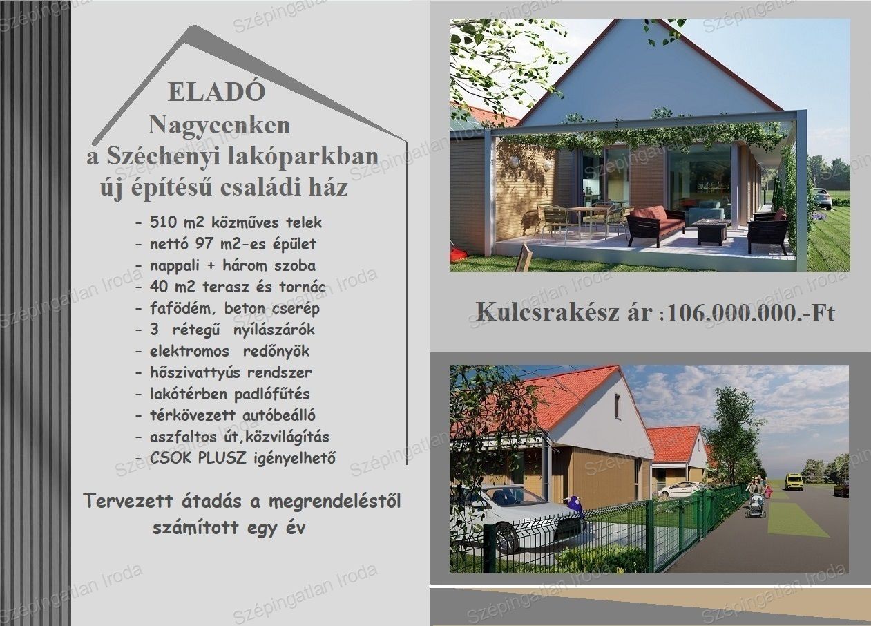 Eladó Nagycenken, a Széchenyi lakóparkban, új családi házas környezetben, nettó 97 m2-es hasznos alapterületű, 510 m2-es telken épülő, új építésű családi ház kulcsrakészen. A helyi építési szabályzat megköveteli a településképbe való illeszkedést, így ez a házterv a hagyomány és a kortárs építészet jegyében készült. Az épület különlegessége a szeparált belső kialakítás, szinte 2 egységre bontva a közösségi teret és a magánszférát, mely igen hasznos lehet nagycsaládosok számára. A három hálószoba, a fürdőszoba és a mellékhelyiség egysége olyan praktikus elhelyezést kapott, hogy nem kell átszelni a házat ahhoz, hogy ezek a helyiségek akár elalvás előtt, akár ébredés után könnyen megközelíthetőek legyenek. A nappali és az étkezőkonyha szintén kiváló egységet alkot, amely a család központi élettere, modern és tágas megjelenésű. Hatalmas nyílászárók teszik még világosabbá, rengeteg fény beengedve az épületbe. A közvetlen kertkapcsolat miatt a tavaszi-nyári, kellemes időjárással rendelkező hónapokban a terasszal egybenyitható. Az ár tartalmazza a telek árát, az épület kulcsrakész állapotát, terasszal és tárolóval, de nem tartalmazza Az ingatlan 10 cm külső szigeteléssel és műanyag, 3 rétegű, fokozottan hőszigetelt külső nyílászárókkal készül. Hőszivattyús rendszer biztosítja a ház fűtését és a meleg vizet, a lakótérben padlófűtéssel. Az ár tartalmazza a telek árát, az épület kulcsrakész állapotát, terasszal és autóbeállóval, de nem tartalmazza a konyhabútort, belső berendezési tárgyakat, lámpákat, valamint a kerítést. BABAVÁRÓ HITEL, CSOK-PLUSZ ÉS A KEDVEZMÉNYES ÁLLAMI TÁMOGATÁSOK, ILLETÉKMENTESSÉG, HITELEK IGÉNYBEVEHETŐK! Irodánk független banki hitelügyintézővel, teljes körű ügyintézéssel áll az Ügyfelek rendelkezésére. Kulcsrakész ár: 106 mFt.