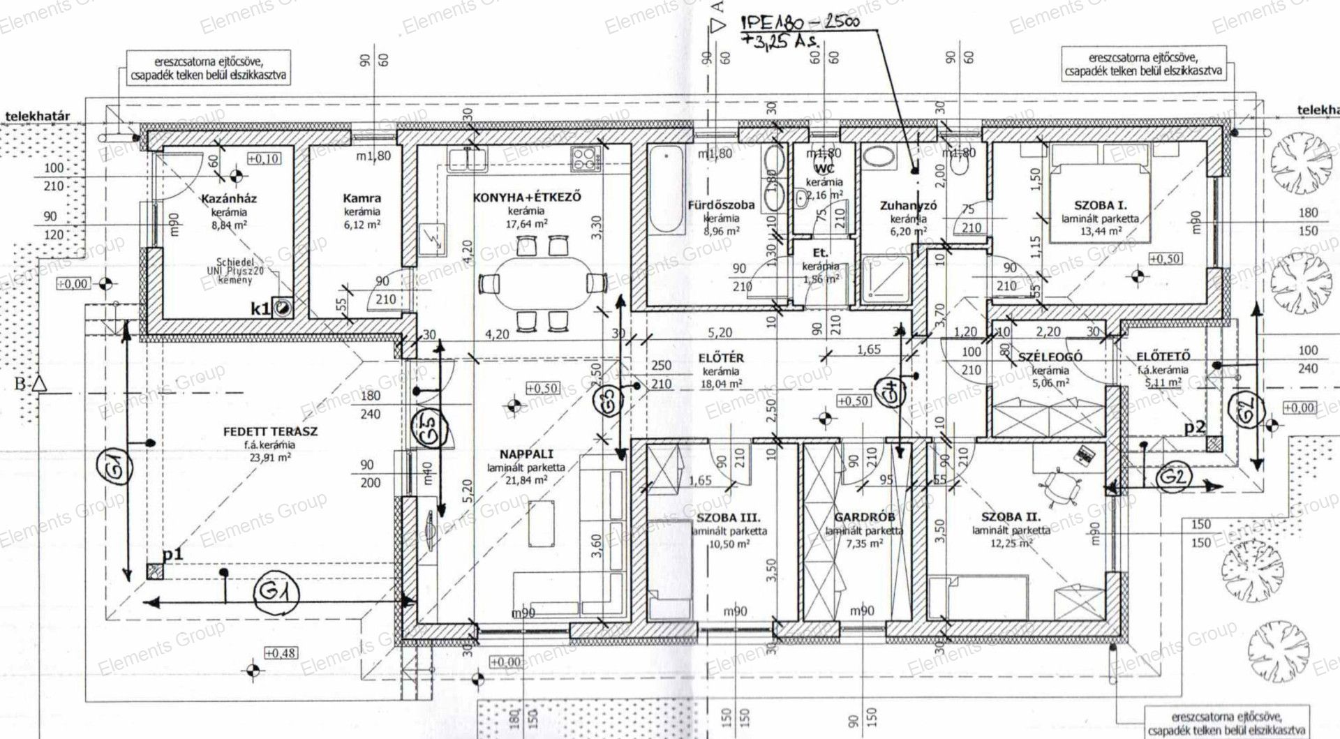 nappali + 3 hálószoba, kamra, gardrób,háztartási helyiség, kazánház