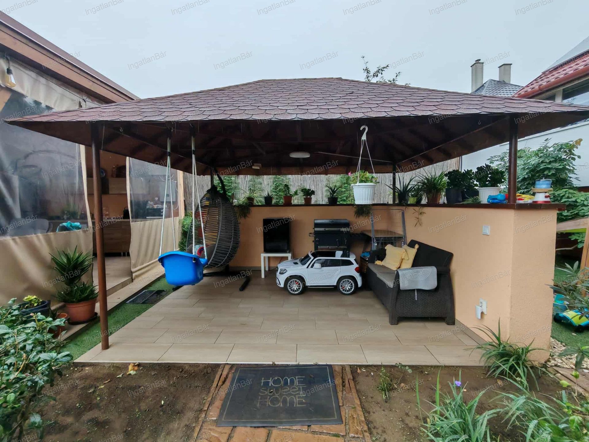 Udvaron garázs, szépen parkosított kerttel, 26 nm es filagória, konyhával, wc-vel