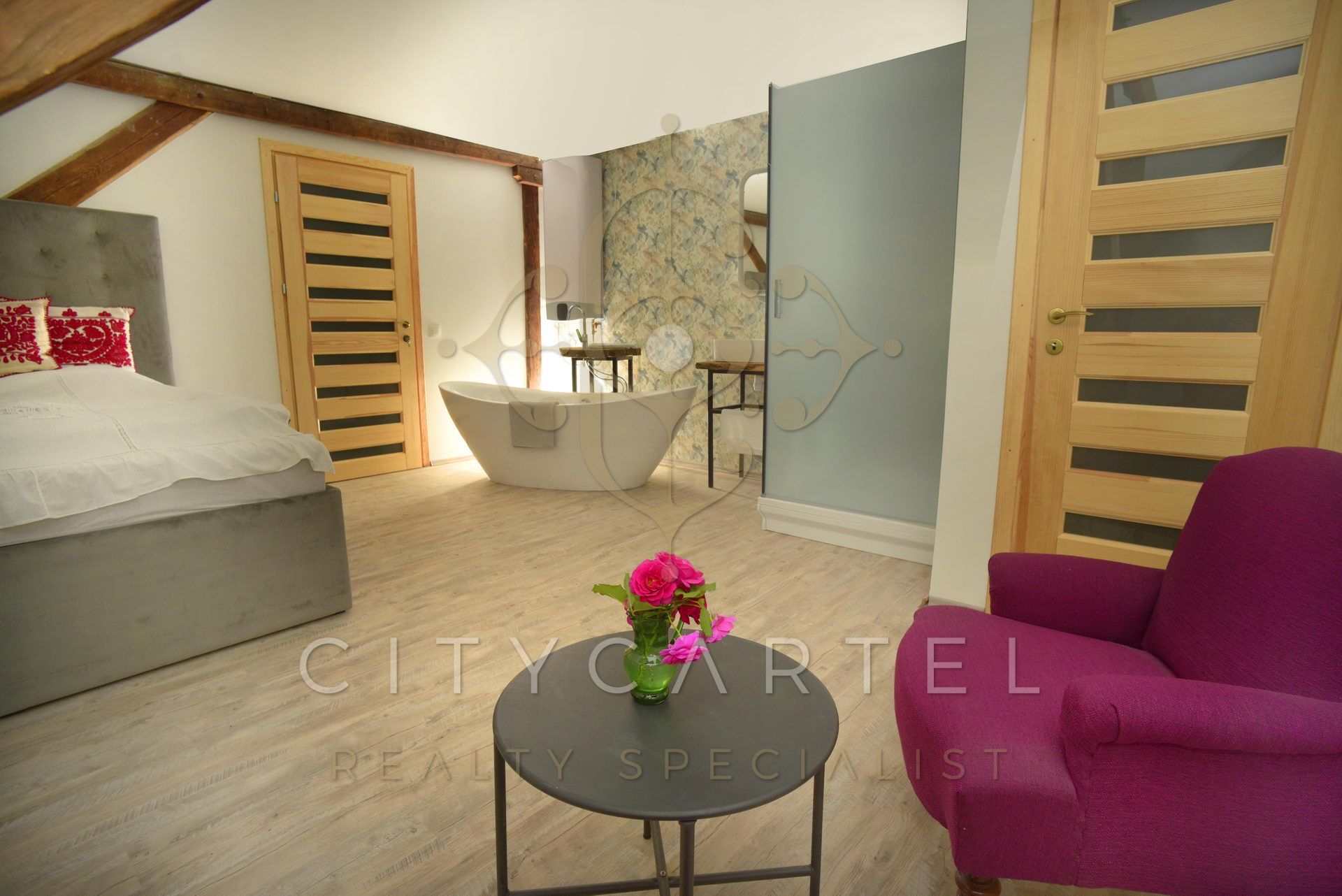 - Földszint: elegáns előtér és hall, 120 nm-es bálterem (amely alkalmas céges rendezvények, kisebb konferenciák, családi események és esküvői vacsorák megtartására 40-50 főig), egy hálószoba káddal, két fürdőszoba, konyha, kiszolgáló területek