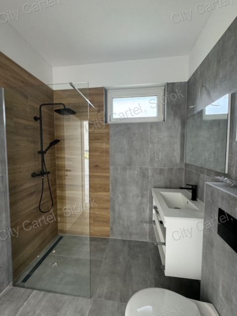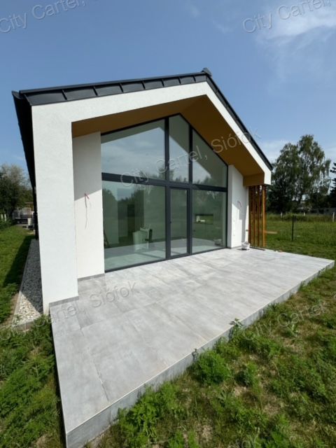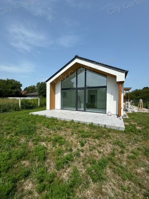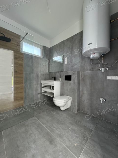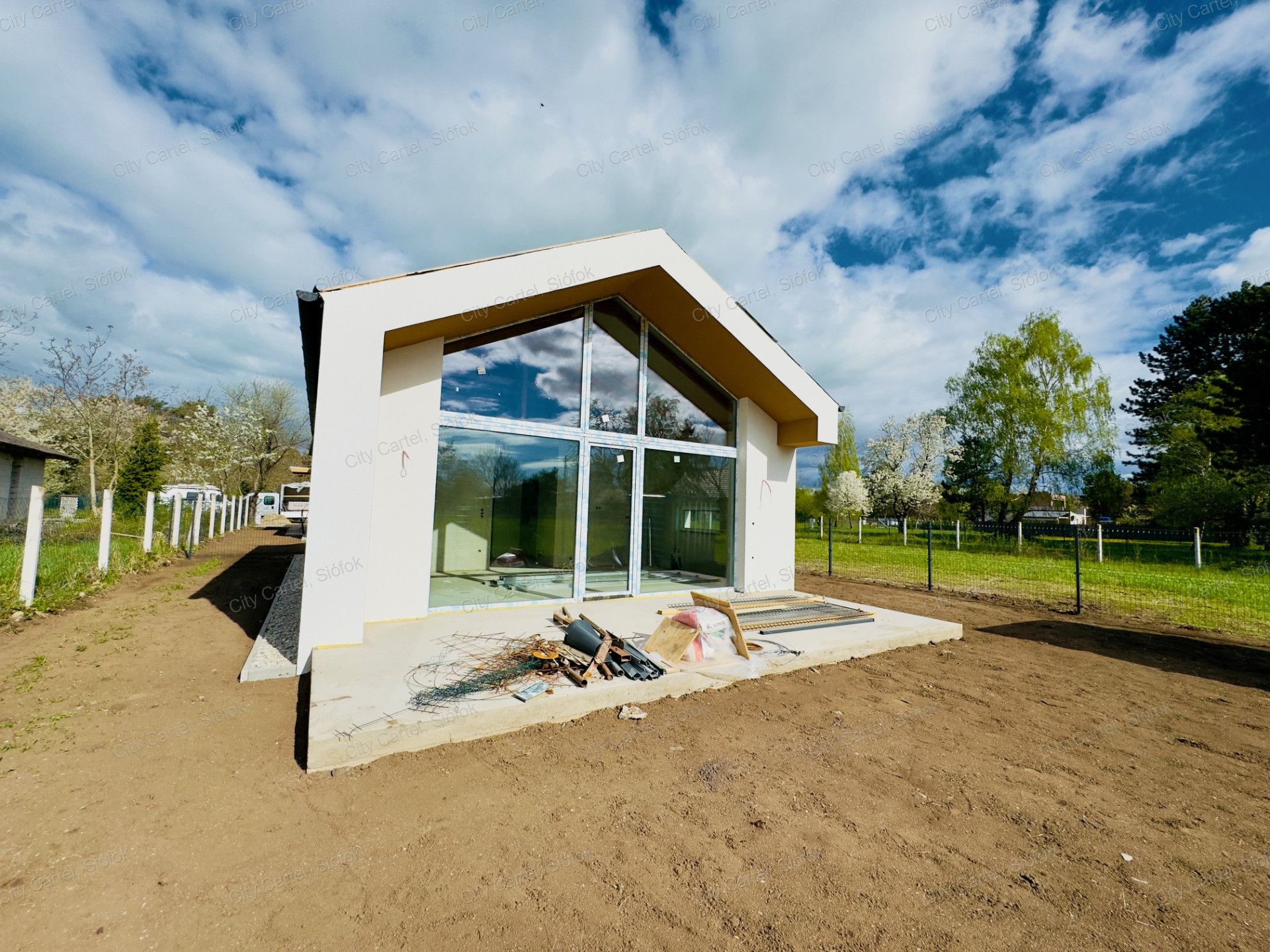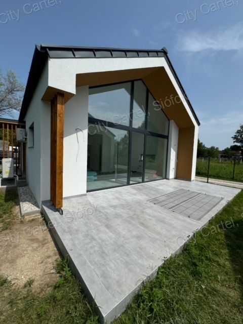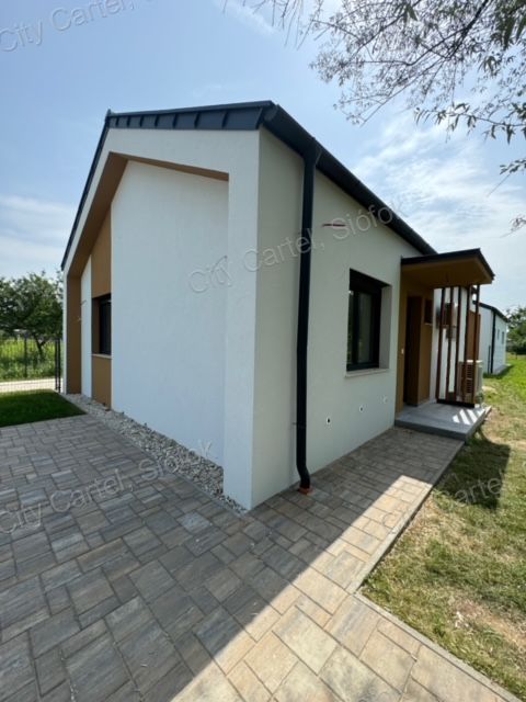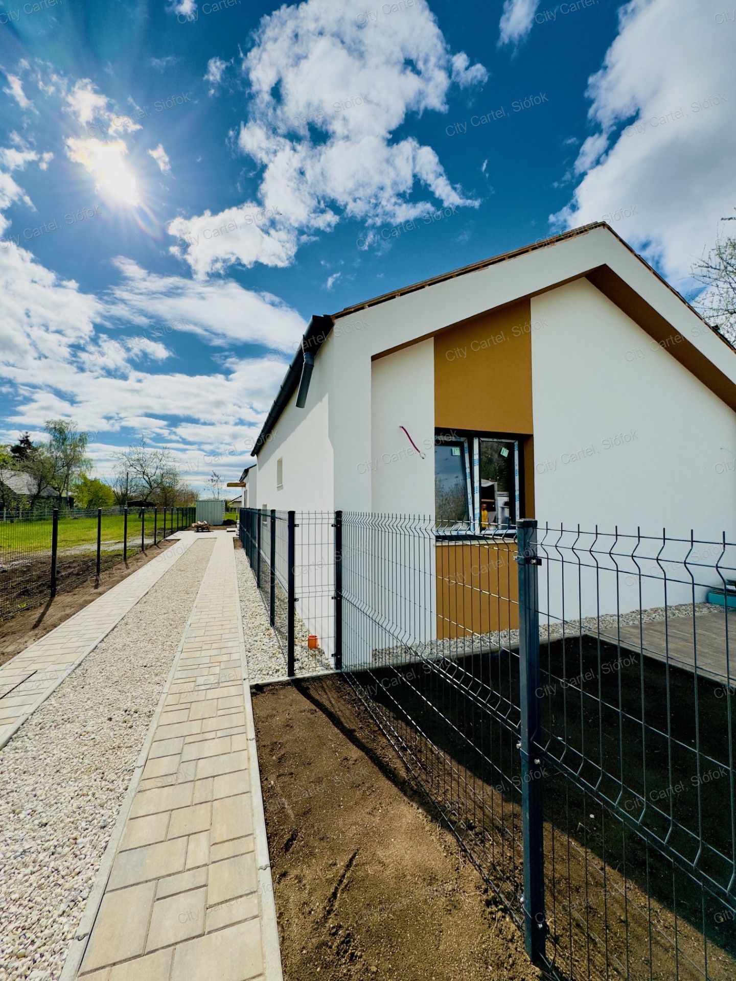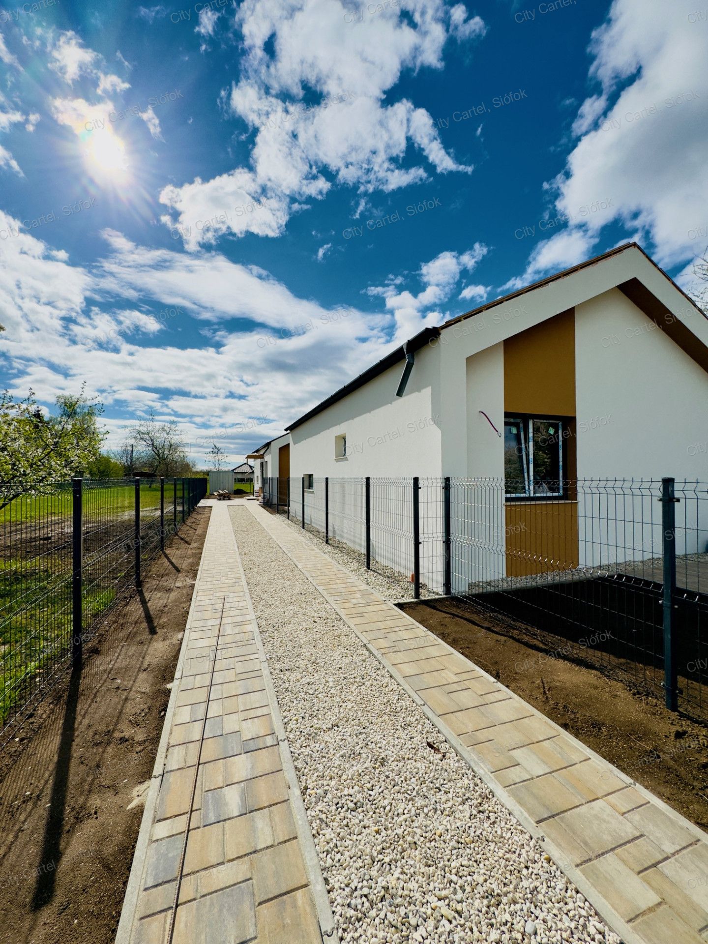 A házhoz egy hatalmas terasz tartozik, melyre a nappaliból egy tolóajtón keresztül léphetünk ki, a hátsó intim kerthez közvetlen kapcsolattal rendelkezik. A belső elosztása a következő: 2 hálószoba, konyha, világos, óriási üvegfelülettel rendelkező nappali, egy tusolós fürdőszoba WC-vel, valamint külön WC került kialakításra.