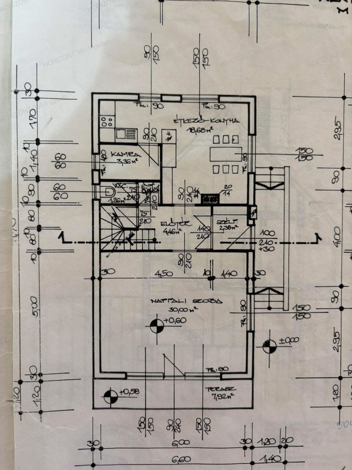 • Földszint 80 nm: mely 35 m²-es, hangulatos teraszkapcsolattal rendelkezik, nappali, előszoba, konyha, étkező, kamra, WC, lépcsőház.