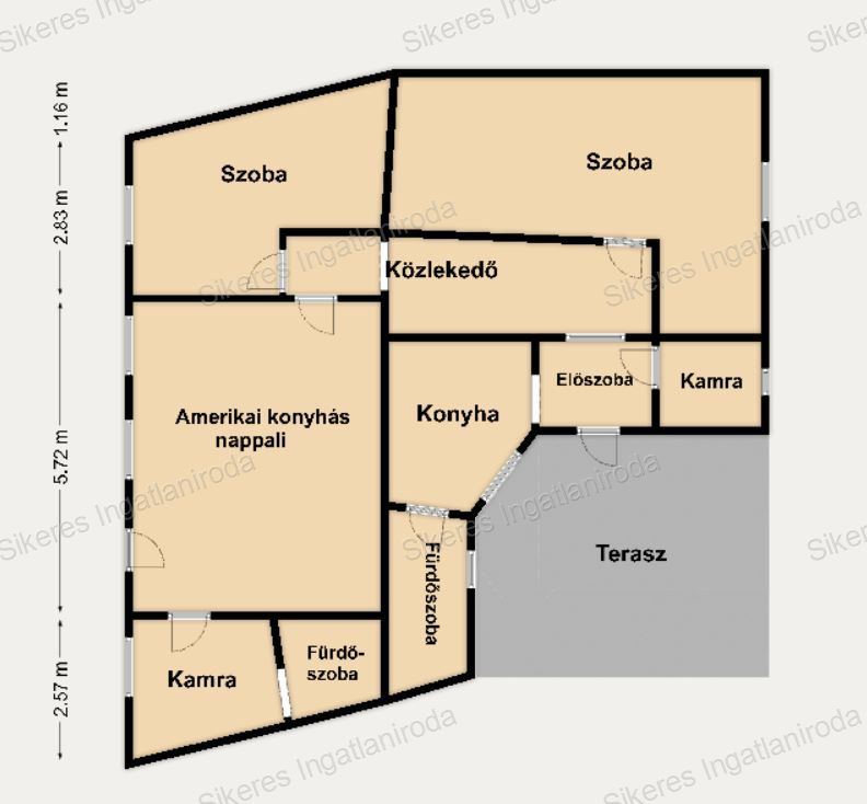 A belső elrendezés tudatos tervezés eredménye: két kényelmes hálószoba mellett egy impozáns méretű amerikai konyhás nappali biztosítja a közösségi élet színterét.