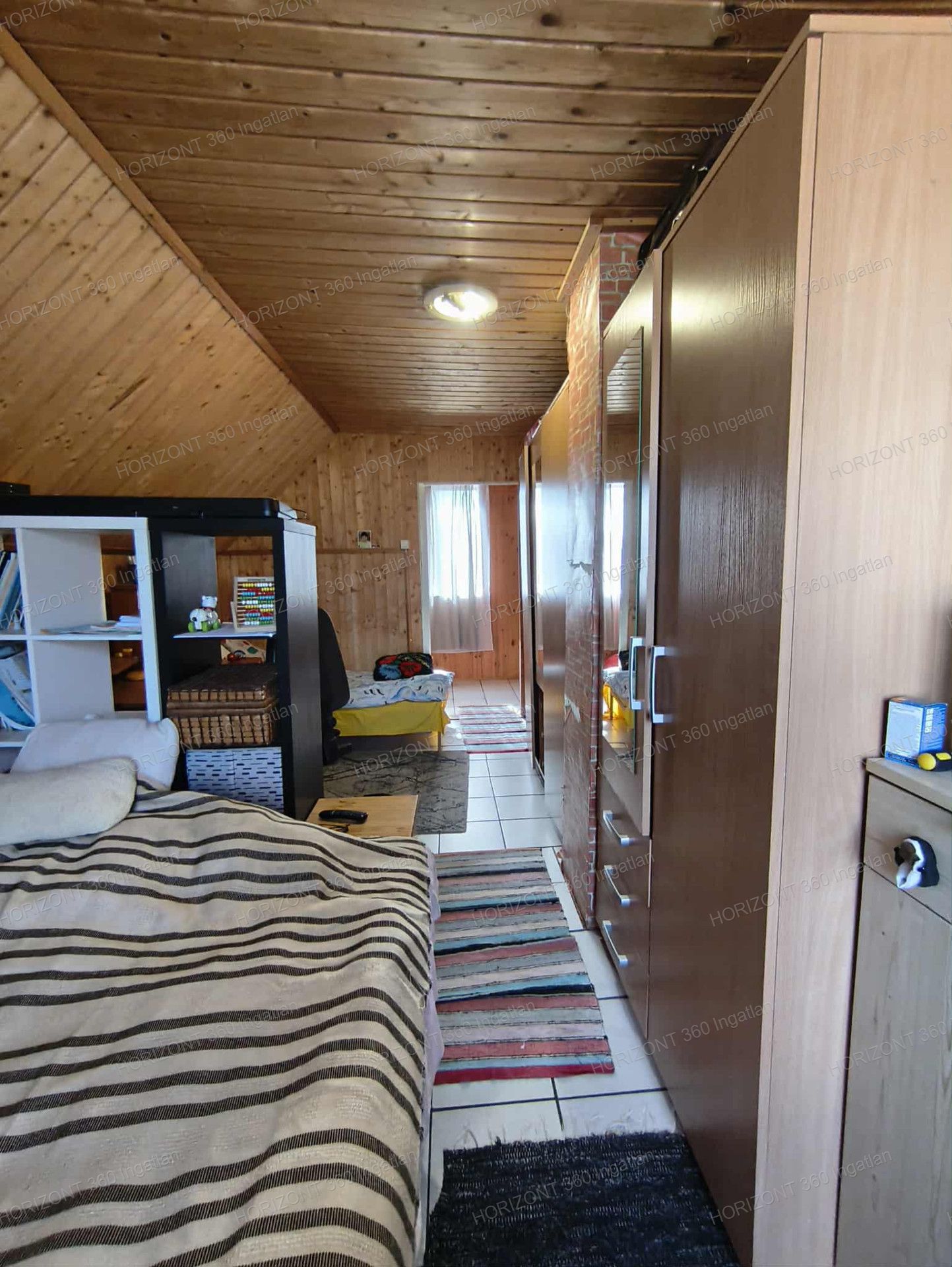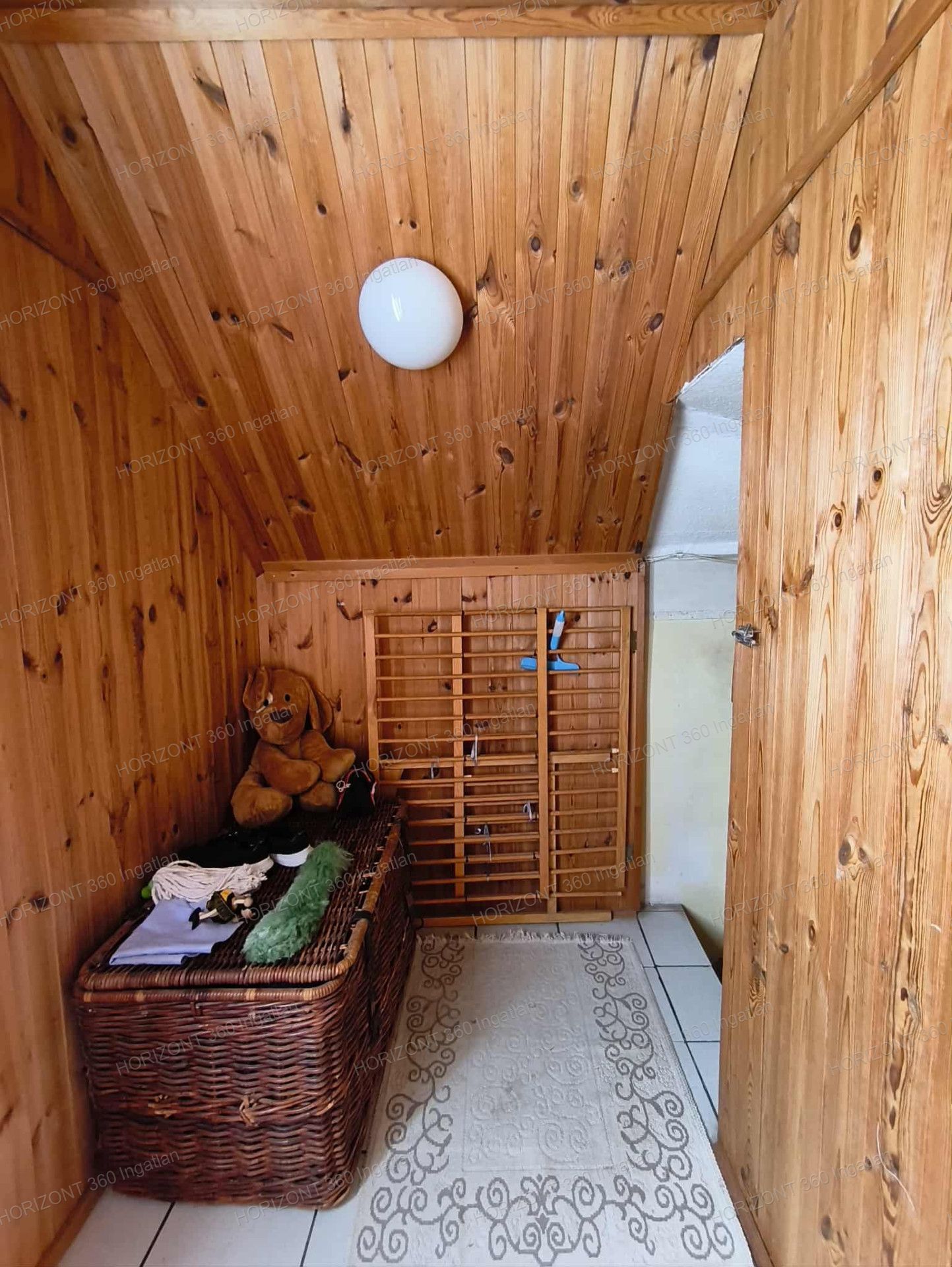 Az ingatlan alsó szintjén nappali, konyha és előszoba található, míg a tetőtérben egy tágas, szigetelt szoba kapott helyet, fa lambériás burkolattal. A közművek (víz, villany, gáz, csatorna) bevezetve, 2x25 A áram biztosított, ezáltal klíma berendezés is szerelhető. Az alsó szinten új villanyvezetékek kerültek kiépítésre. A fűtés konvektorral megoldott, de a dupla kémény lehetőséget ad kandalló vagy cserépkályha beépítésére is.