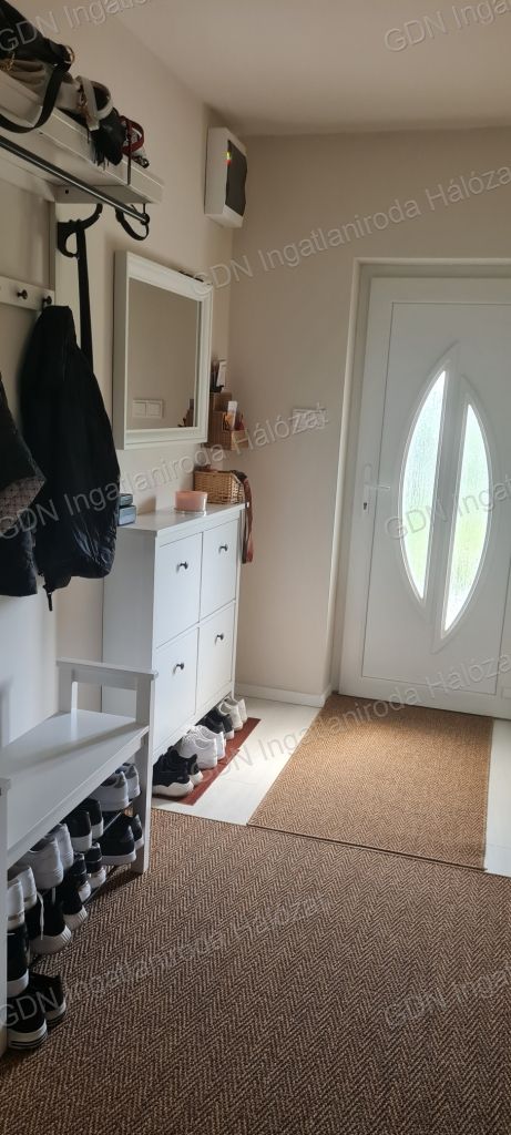 Eladó egy újszerű állapotban lévő, 138 m²-es családi ház, amely jogilag családi ház, de kialakításában inkább egy ikerház jellegű ingatlan – az épületek csak a fedett kocsibeállónál érnek össze.