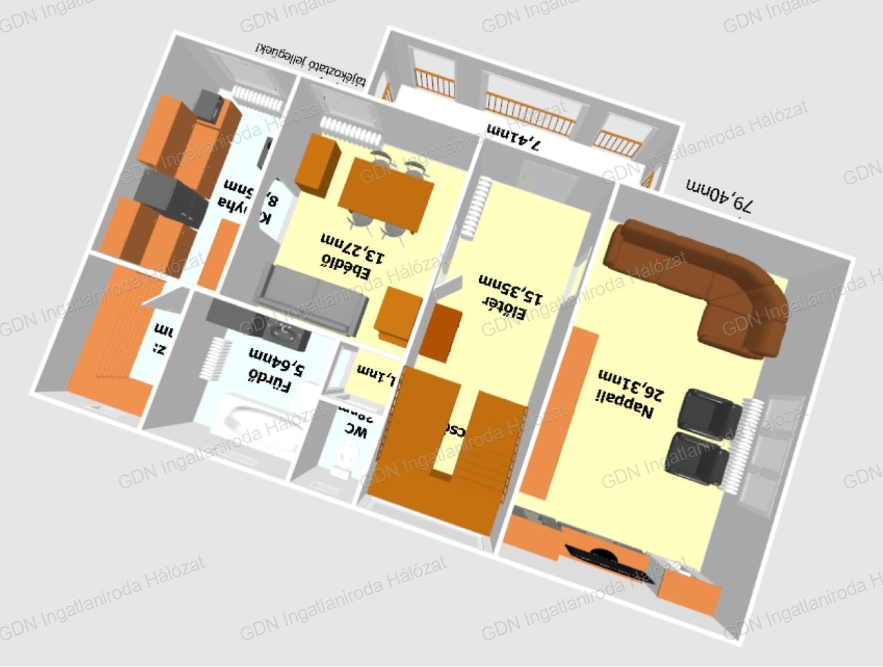 Az épület lakóterének összes hasznos alapterülete 133,99nm melyben található: