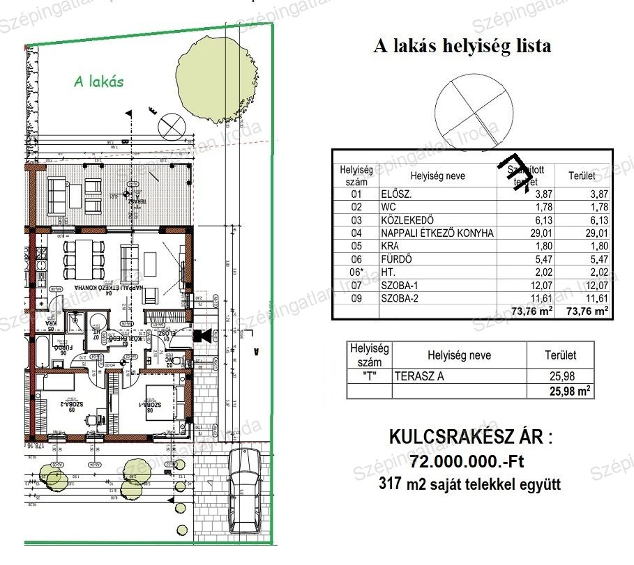 A Szépingatlan Iroda eladásra kínál Fertőszentmiklóson, kialakulóban lévő új, kertvárosi környezetben, 3 szobás önálló mérőórákkal rendelkező, egy szintes ikerházat. Ez a tégla falszerkezetű épület minden modern komfortot magában foglal, és tökéletes otthona lehet egy kis családnak vagy fiatal párok első lakásának. Az ingatlan nagyon korszerű, és minden részletét az életminőség javítására tervezték. Kiváló minőségű anyagokból készül és az energiahatékonyságra is nagy hangsúlyt fektettek. Fűtése minden helyiségben padlófűtés, 3 termosztát vezérléssel, a legmodernebb hőszivattyúval, H tarifás rendszerre kiépített, így az energiaköltségek várhatóan minimálisak lesznek. Kivitelezéskor 3 rétegű, hőszigetelt, nagy üvegfelületű, műanyag nyílászárók kerülnek beépítésre, kívül antracit színű, belül fehér kivitelben, fehér színű redőnyökkel. Az ingatlanokhoz térkövezett járda és egy autó részére kényelmes parkoló tartozik. A két új építésű kertes lakás egy önálló családi házban található. Az „A” épület nettó alapterülete 74nm, melyhez saját használatú kertrész tartozik, ennek mérete 300 nm. A nappali +2 hálószobás lakrészek külön hőszivattyús fűtési rendszerrel és önálló mérőórákkal lesznek ellátva. Mindkét lakást egy 25 m2-es, részben fedett terasz kapcsolja össze a saját kertjével. A homlokzati falak 15 cm grafitos szigeteléssel készülnek. Végezetül az épület dryvit rendszerű, fehér színű nemesvakolatot kap. Külön szeparált bejáraton keresztül lehet megközelíteni a lakrészeket, innen lehet bejutni a ház privát szférájába. Az ingatlan jól járható murvás útról megközelíthető, fekvése miatt az épület elhelyezésére oly módon volt lehetőség, hogy az új tulajdonosok külön élettere zavartalan marad. Az épület teraszáról teljes rálátás nyílik a házat "L" alakban körül ölelő kertre. A város infrastruktúrája minden korosztály számára megfelelő, orvosi rendelők, posta, élelmiszerboltok, iskola, óvoda, bölcsöde, gyógyszertár a központban pár perc séta távolságra megtalálhatók. Átadása kulcsrakész állapotban, garanciával biztosított! Referencia munkák megtekinthetők! CSOK PLUSZ, családtámogatási hitelek igénybevehetők. A vásárláshoz teljes jogi háttérrel, díjmentes hitel-ügyintézéssel állunk az Ügyfelek rendelkezésére. "A" lakás kulcsrakész ára: 72 mFt.