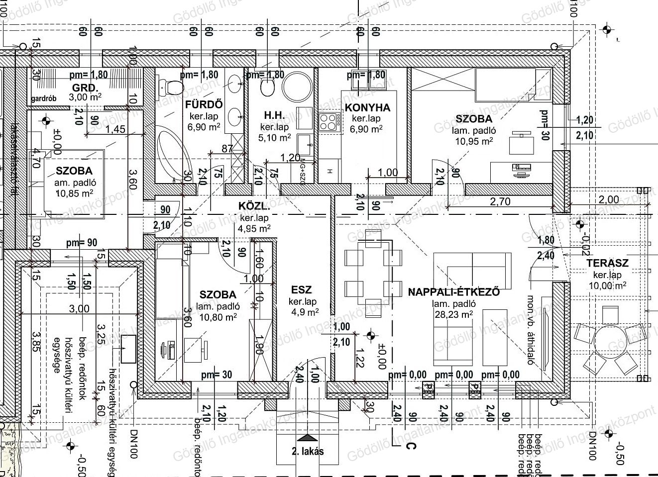 - Előszoba, nappali-konyha-étkező, közlekedő, 2 szoba, fürdő, vendégmosdó, háztartási helyiség + 10nm terasz