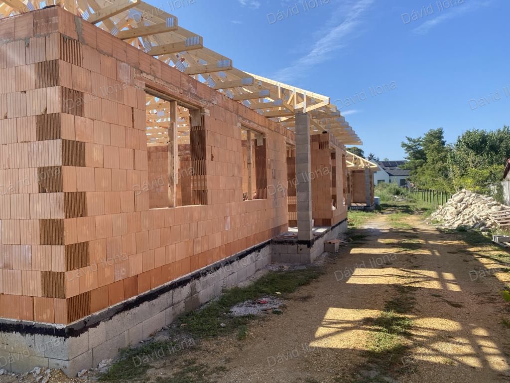 Győr közelében, Győrújfalu csendes, kertvárosias részén eladó egy modern kivitelezésű, 103,3 m²-es ikerház. A saját használatú telekrész 806 m², így bőven jut hely kertnek és kikapcsolódásnak. A két épület teljesen elkülönül egymástól, csak a tároló kapcsolódik össze.