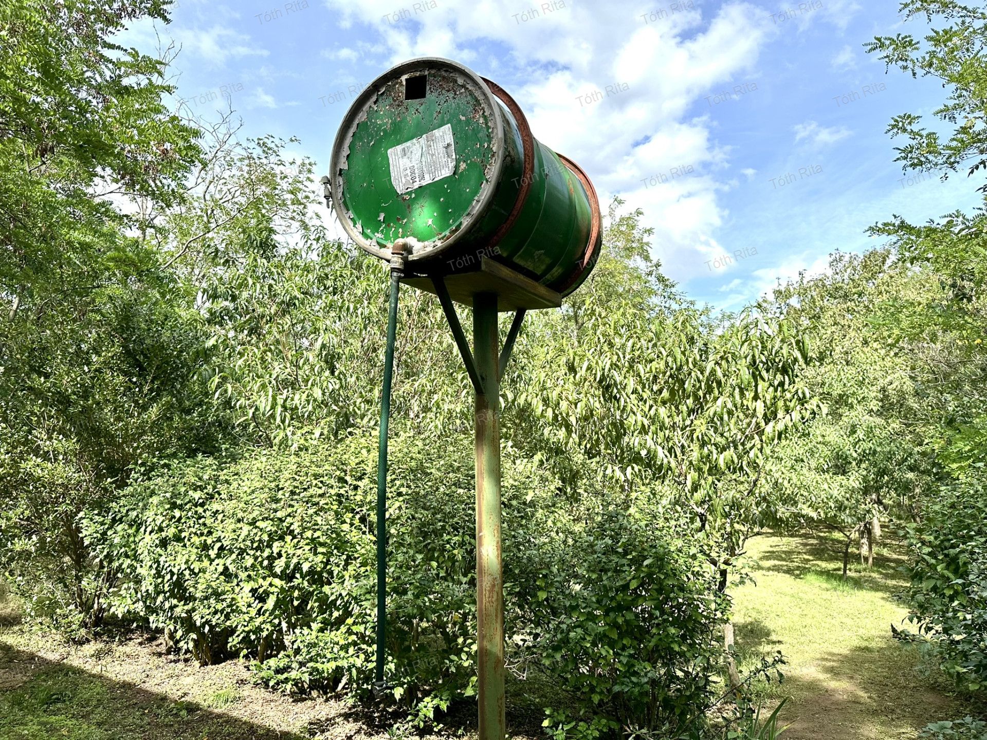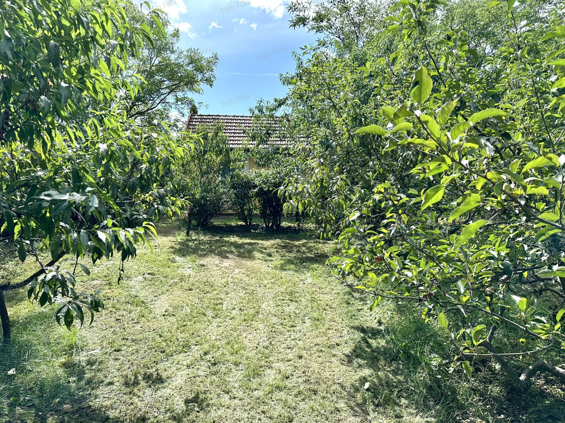 - gondozott kert gyümölcsfákkal és örökzöldekkel