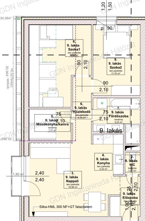 A B9 megjelölésű második emeleti lakás 62,7 m2 alapterületű. Az amerikai konyhás nappalin túl 2 szoba, háztartási helyiség/kamra, fürdőszoba, mellékhelyiség, és előszoba kapott teret a lakásban. A közösségi térből közelíthető meg a 2 m2-es erkély.