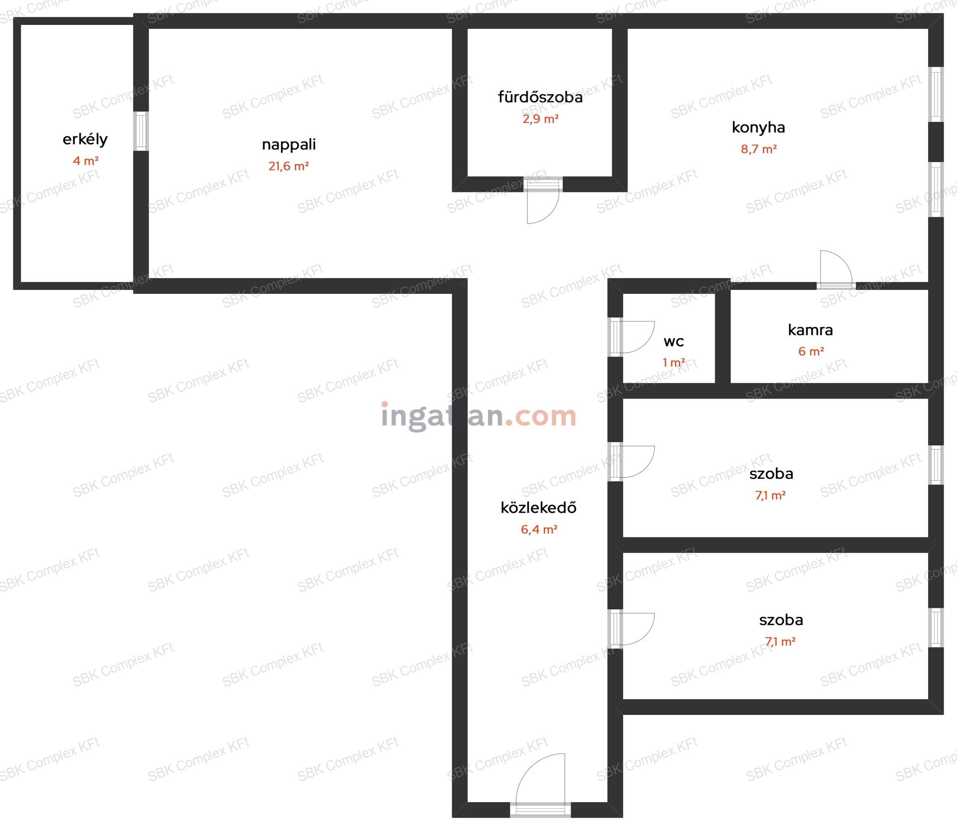 A lakás praktikus elrendezésű: nappali, két külön nyíló szoba, konyha, előszoba, fürdőszoba, külön WC, kamra, valamint egy erkély/terasz tartozik hozzá. A terek jól kihasználhatók, minden helyiség külön bejárattal rendelkezik, így biztosítva a lakók kényelmét.