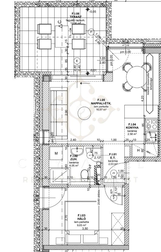Beosztását tekintve egy amerikai konyhás nappali + étkező egy légtérben, egy előtér, egy hálószoba, egy WC-s, zuhanyzós fürdőszoba és egy terasz került benne kialakításra.