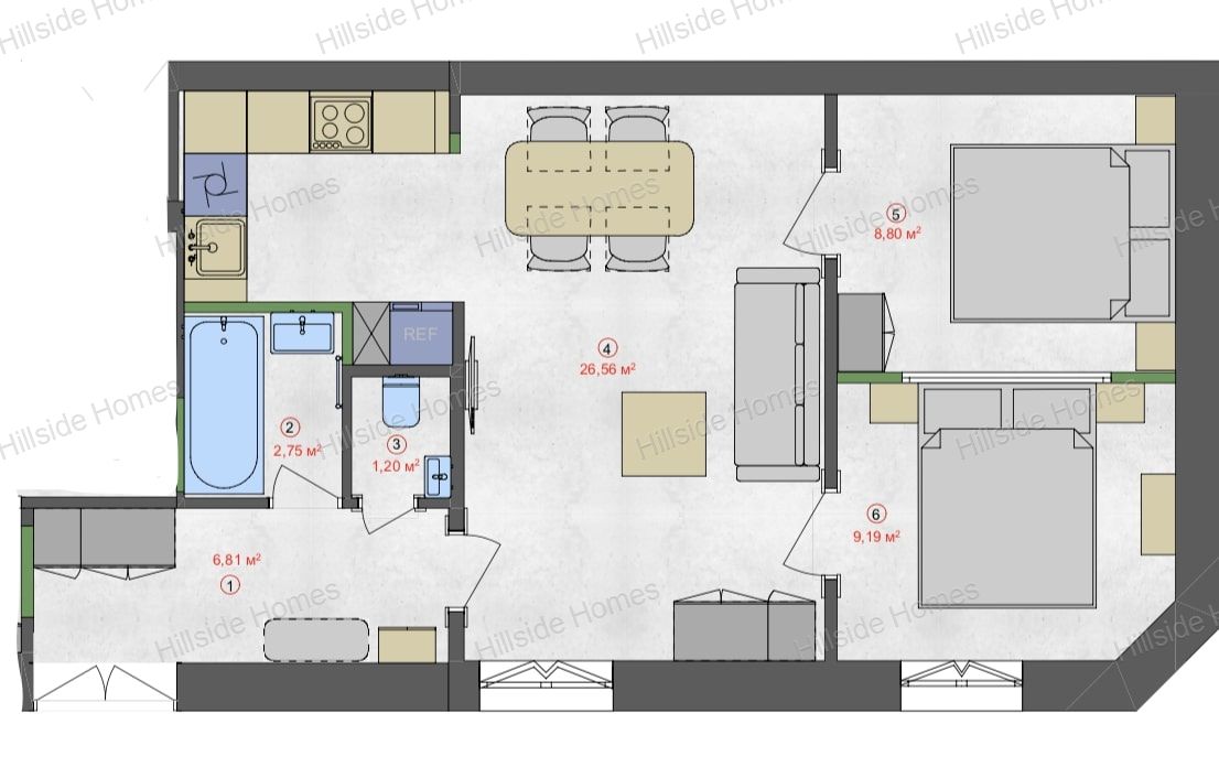Tágas és modern: Az 56 m²-es lakás kényelmes, családbarát elrendezéssel büszkélkedhet, prémium anyagokkal és igényes kivitelezéssel.