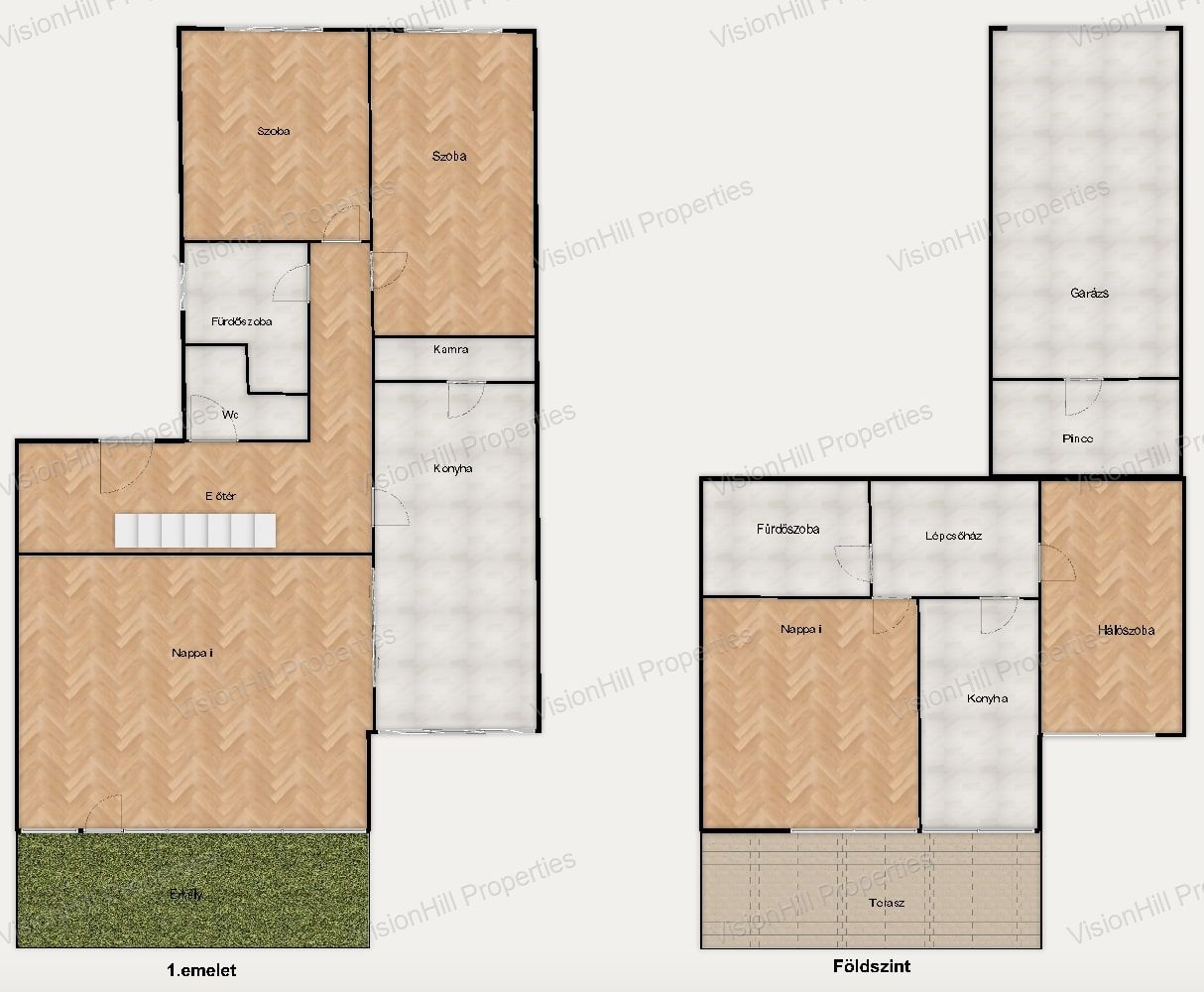 Felső szint (80 m²): nappali, két hálószoba, konyha, kamra, fürdőszoba, külön WC és erkély.